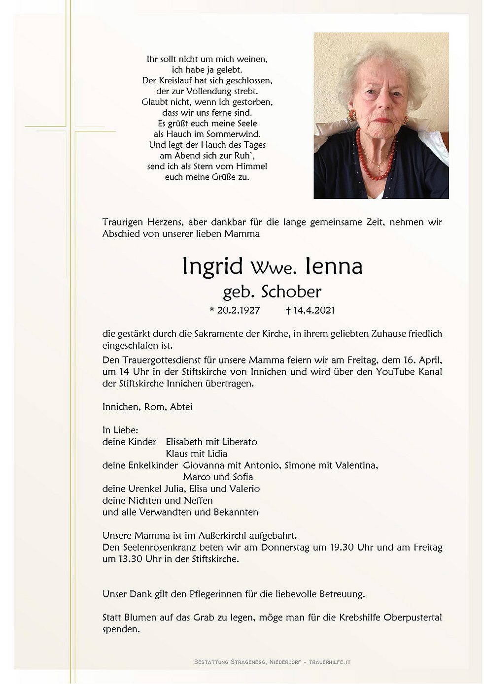 Den Trauergottesdienst für unsere Mamma feiern wir am Freitag, dem 16. April, um 14 Uhr in der Stiftskirche von Innichen und wird über den YouTube Kanal der Stiftskirche Innichen übertragen.