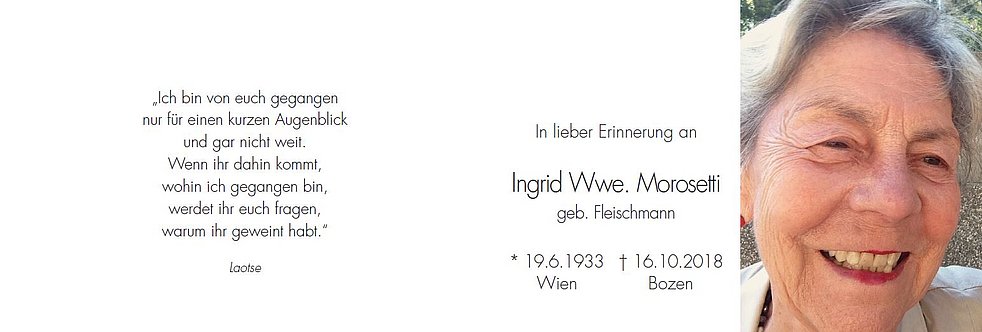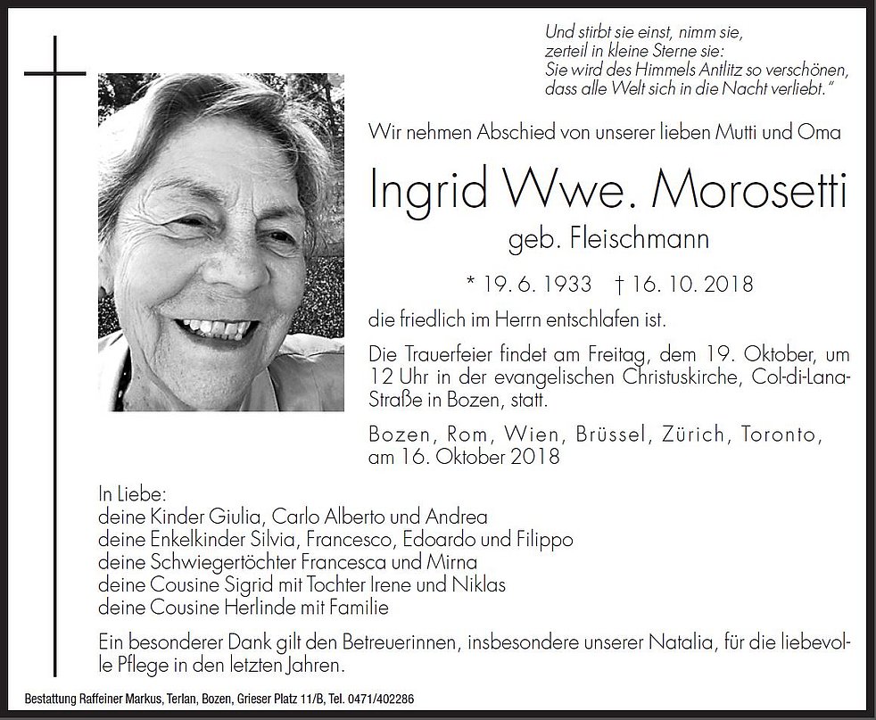 Die Trauerfeier findet am Freitag, dem 19. Oktober, um 12 Uhr in der evangelischen Christuskirche, Col di Lana Straße in Bozen statt.