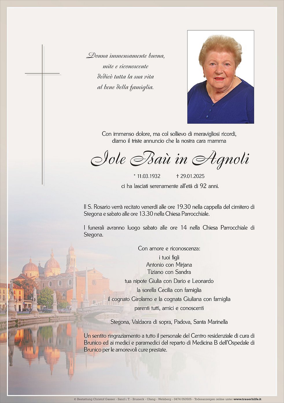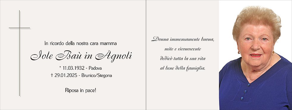Un sentito ringraziamento a tutto il personale del Centro residenziale di cura di Brunico ed ai medici e paramedici del reparto di Medicina B dell’Ospedale di Brunico per le amorevoli cure prestate.
