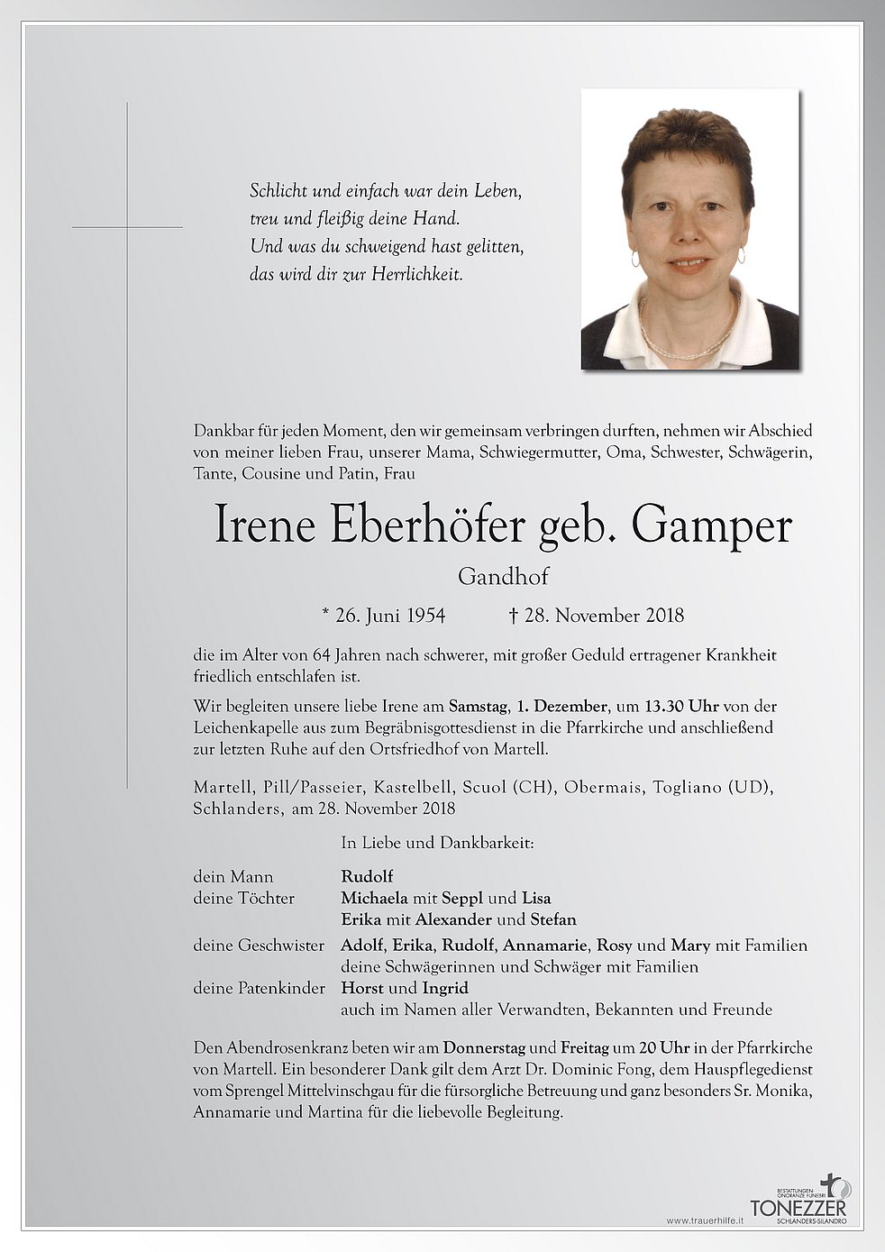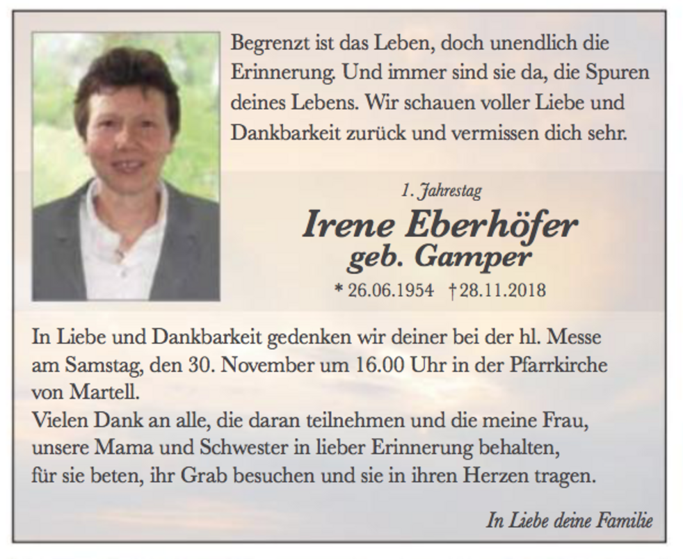 Wir begleiten unsere liebe Irene am Samstag, 1. Dezember, um 13.30 Uhr von der Leichenkapelle aus zum Begräbnisgottesdienst in die Pfarrkirche und anschließend zur letzten Ruhe auf den Ortsfriedhof von Martell.
