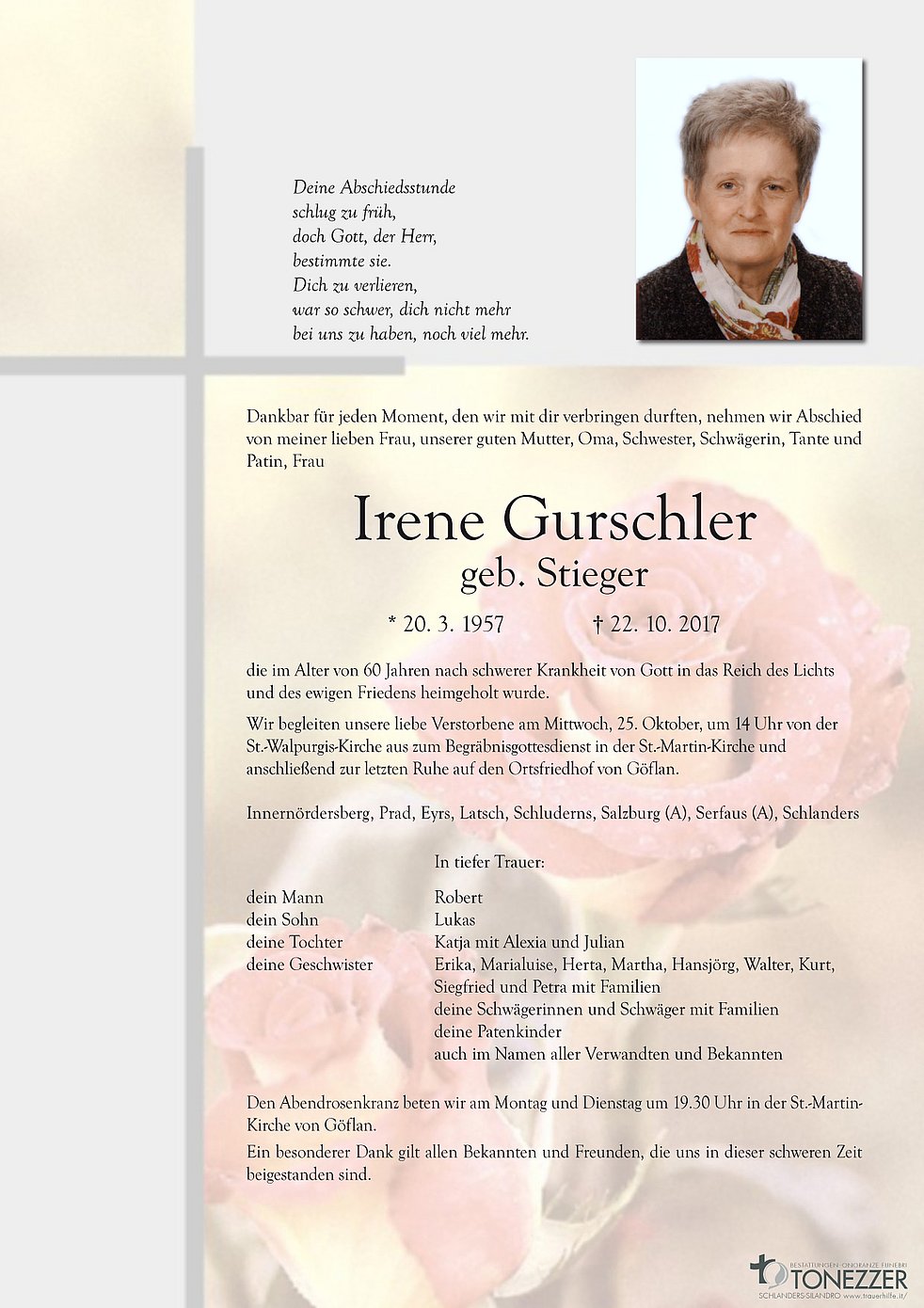Wir begleiten unsere liebe Verstorbene am Mittwoch, 25. Oktober, um 14 Uhr von der St.-Walpurgis-Kirche aus zum Begräbnisgottesdienst in der St.-Martins-Kirche und anschließend zur letzten Ruhe auf den Ortsfriedhof von Göflan.