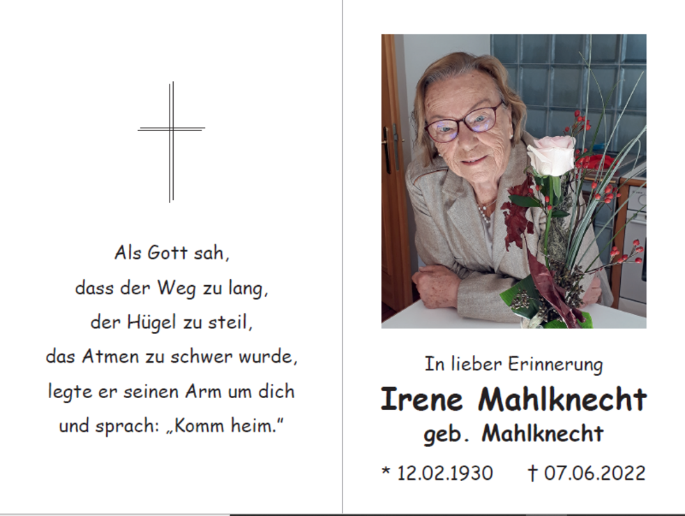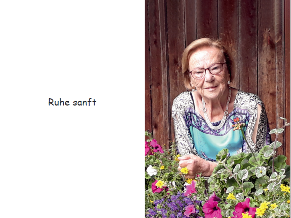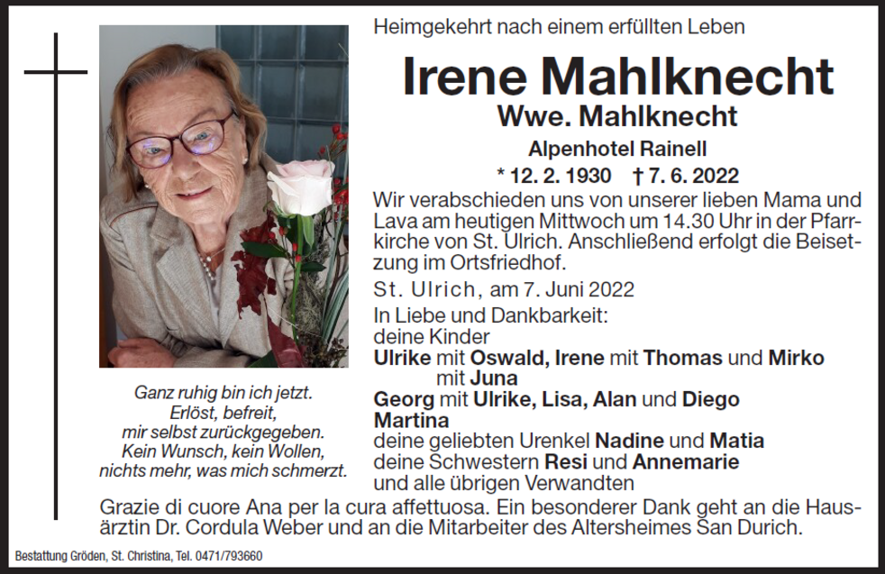 Wir verabschieden uns von unserer lieben Mama und Lava am Mittwoch, dem 08. Juni, um 14.30 Uhr in der Pfarrkirche von St. Ulrich. Anschließend erfolgt die Beisetzung im Ortsfriedhof.