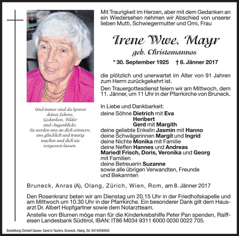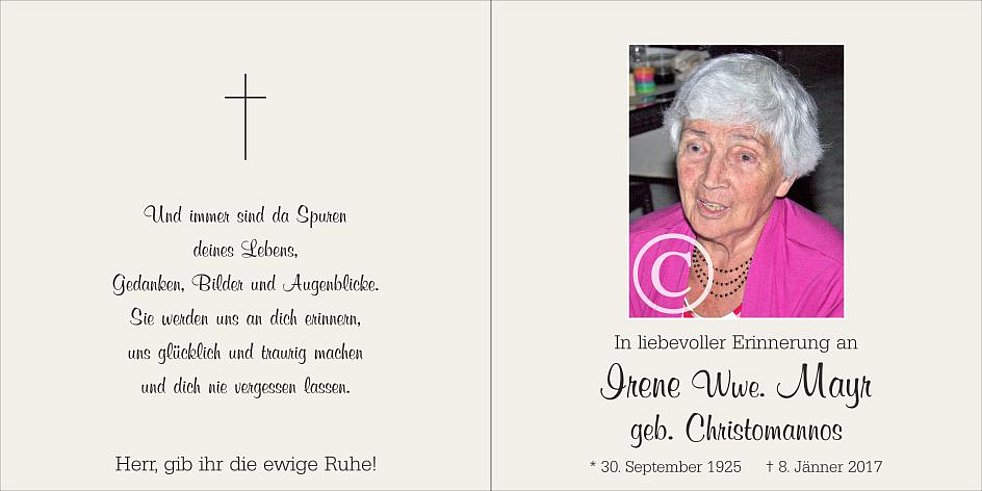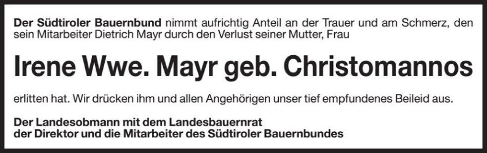 Anstelle von Blumen möge man für die Kinderkrebshilfe Peter Pan spenden. Raiffeisen Landesbank Südtirol IBAN: IT86 M034 9311 6000 0030 0022 705