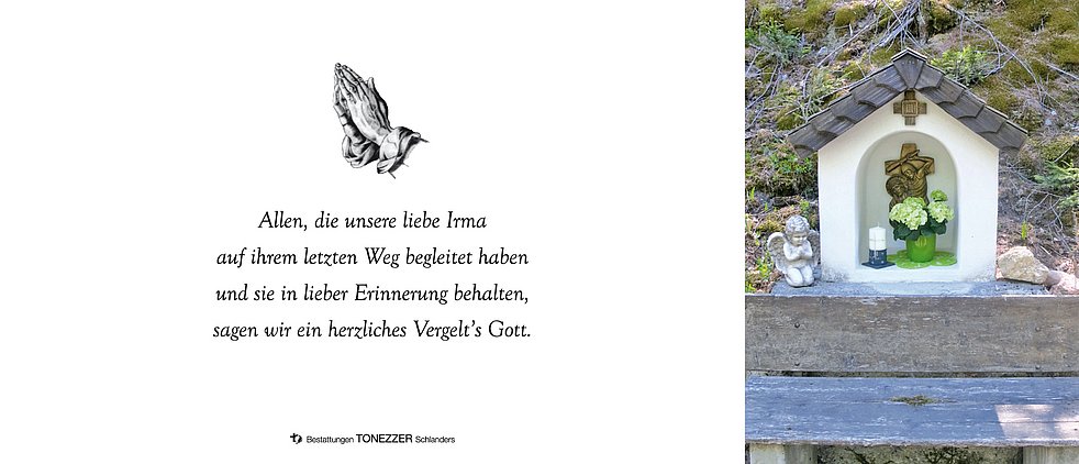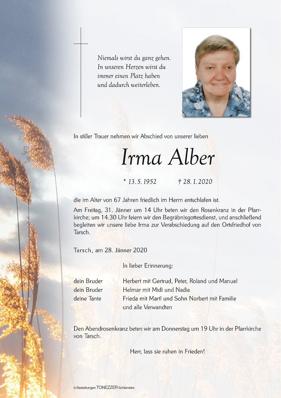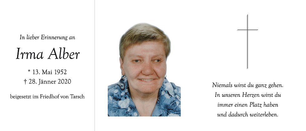 Am Freitag, 31. Jänner um 14 Uhr beten wir den Rosenkranz in der Pfarrkirche; um 14.30 Uhr feiern wir den Begräbnisgottesdienst, und anschließend begleiten wir unsere liebe Irma zur Verabschiedung auf den Ortsfriedhof von Tarsch.