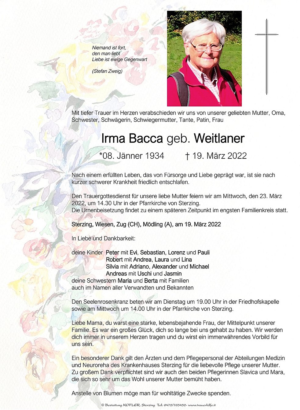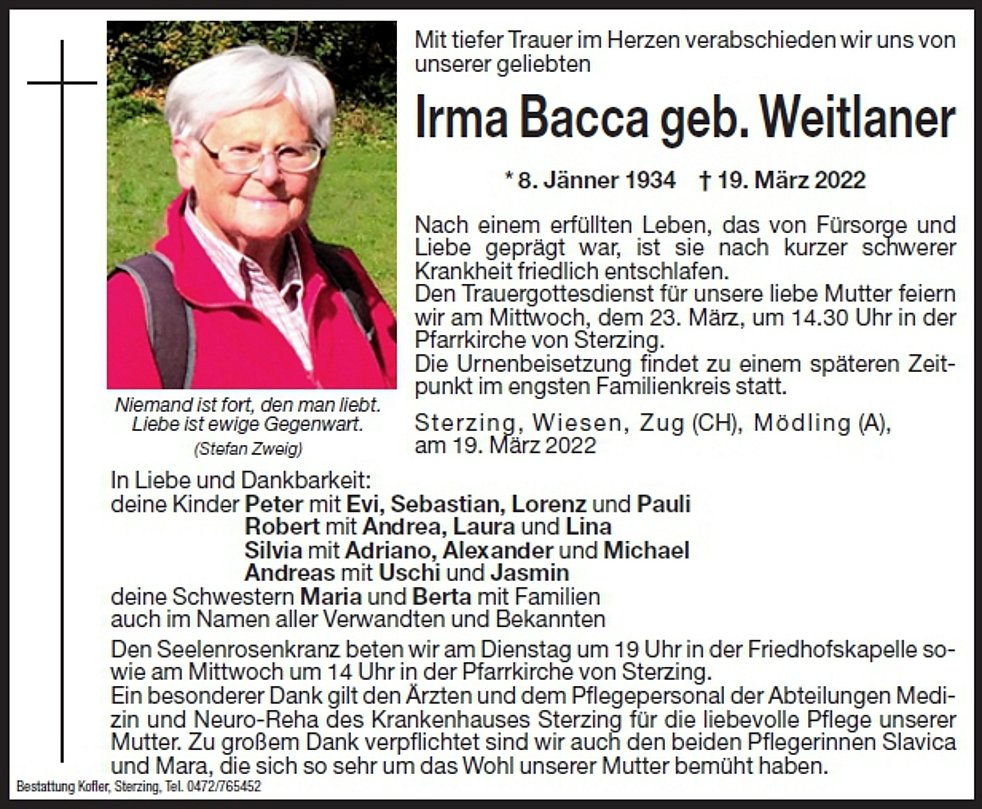 Den Trauergottesdienst für unsere liebe Mutter feiern wir am Mittwoch, den 23. März 2022, um 14.30 Uhr in der Pfarrkirche von Sterzing. Die Urnenbeisetzung findet zu einem späteren Zeitpunkt im engsten Familienkreis statt.