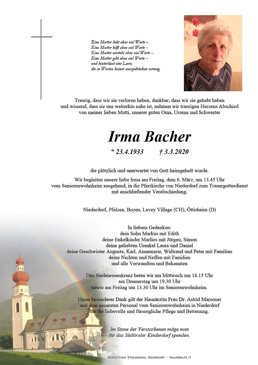 Wir begleiten unsere liebe Irma am Freitag, dem 6. März, um 13.45 Uhr vom Seniorenwohnheim ausgehend, in die Pfarrkirche von Niederdorf zum Trauergottesdienst mit anschließender Verabschiedung.