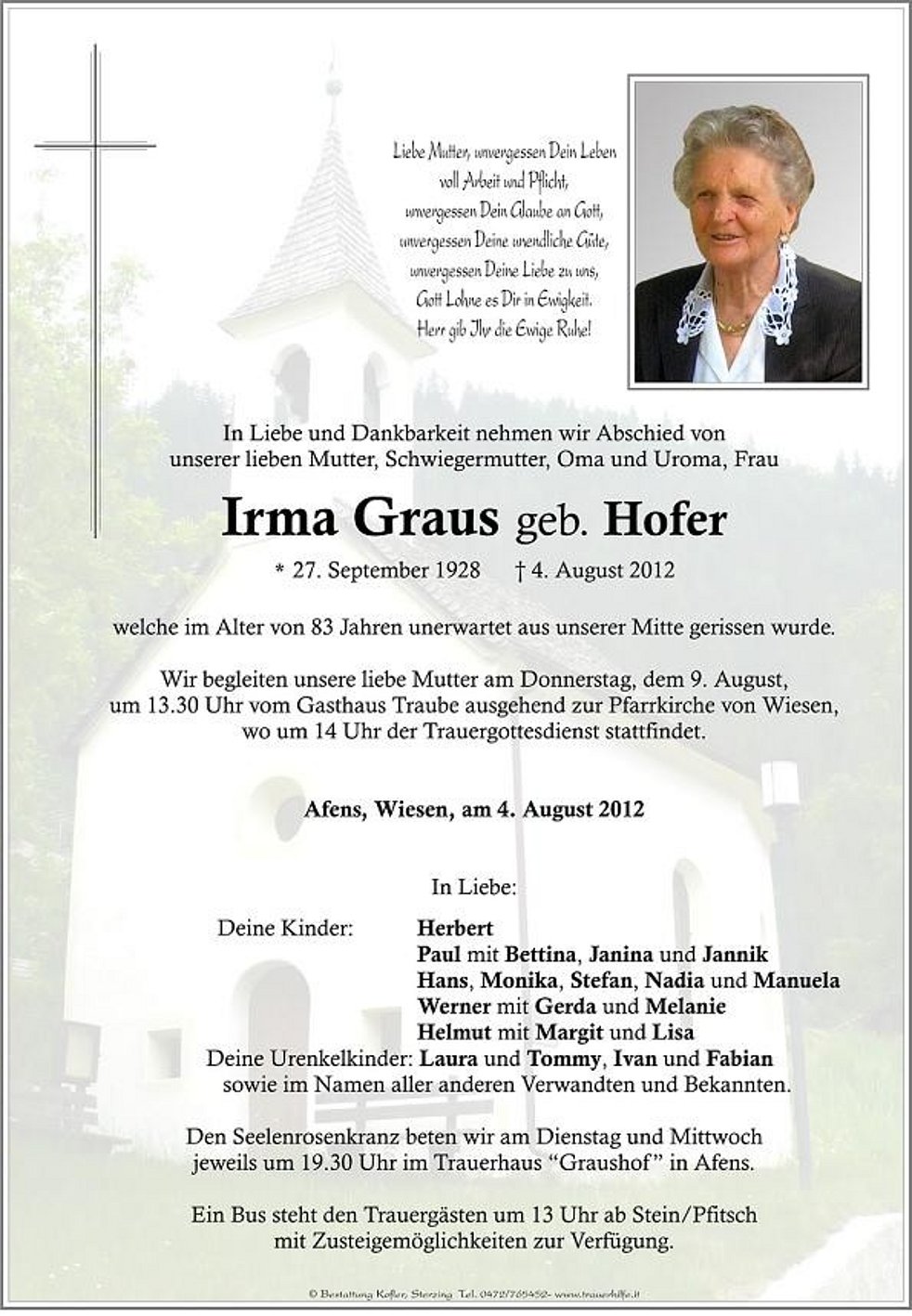 Wir sind geschockt über den tod eurer lieben Mutter irma .
