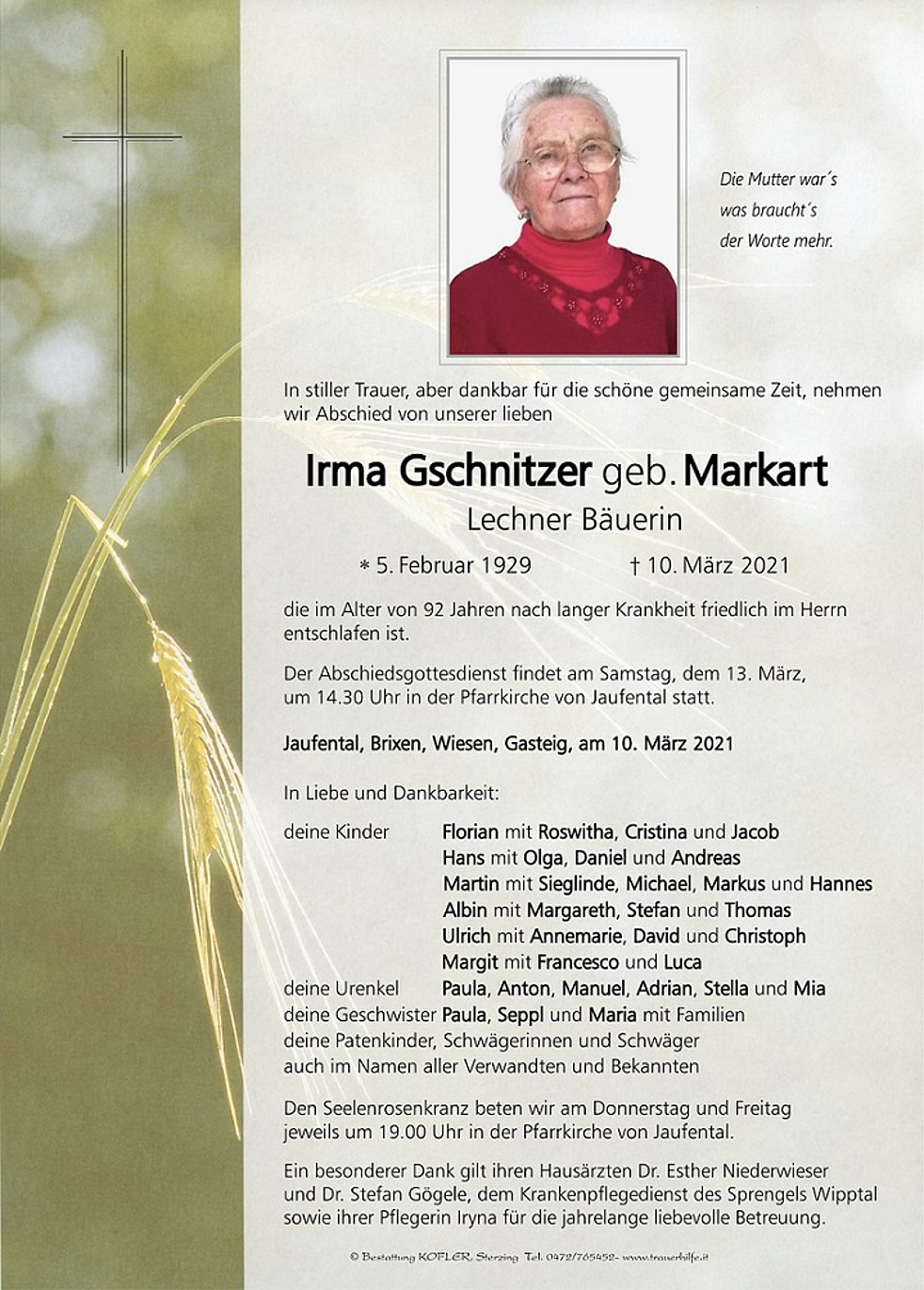 Ein besonderer Dank gilt ihren Hausärzten Dr. Esther Niederwieser und Dr. Stefan Gögele, dem Krankenpflegedienst des Sprengels Wipptal sowie ihrer Pflegerin Iryna für die jahrelange liebevolle Betreuung.