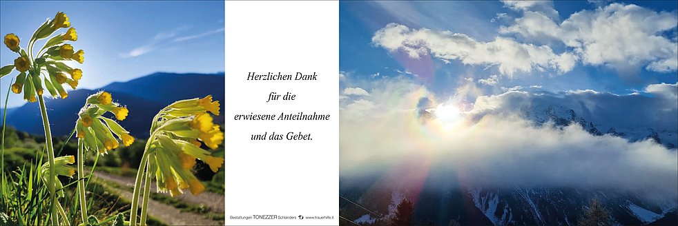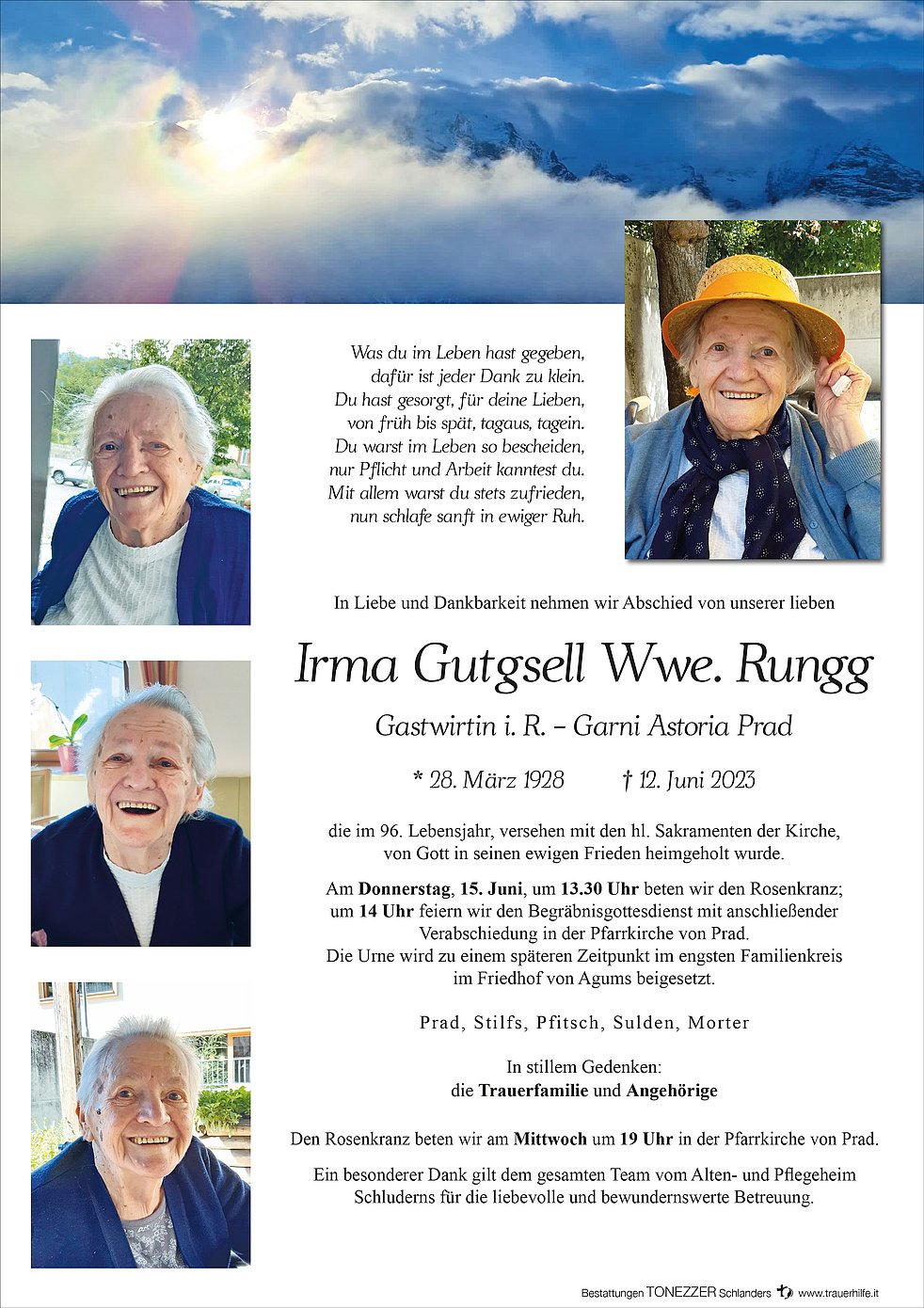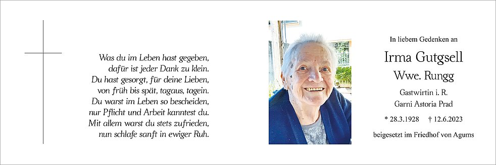Am Donnerstag, 15. Juni, um 13.30 Uhr beten wir den Rosenkranz; um 14 Uhr feiern wir den Begräbnisgottesdienst mit anschließender Verabschiedung in der Pfarrkirche von Prad. Die Urne wird zu einem späteren Zeitpunkt im engsten Familienkreis im Friedhof von Agums beigesetzt.