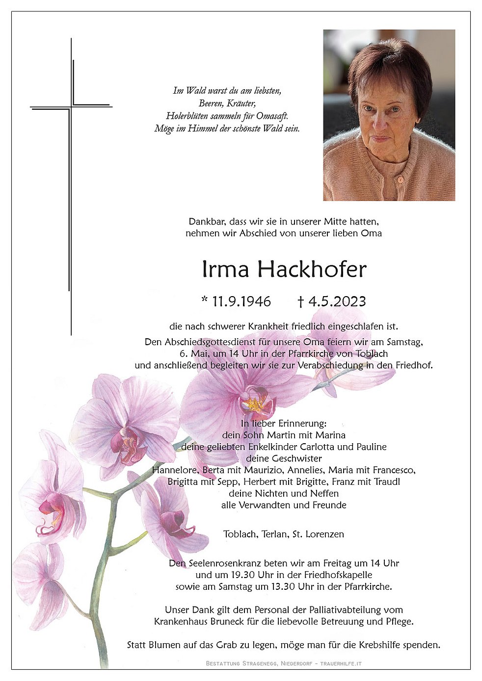 Lieber Martin, liebe Geschwister Hackhofer, tief betroffen habe ich vom Tod von Frau Irma erfahren und möchte euch mein aufrichtiges Beileid aussprechen. Sie ruhe in Frieden 🌻