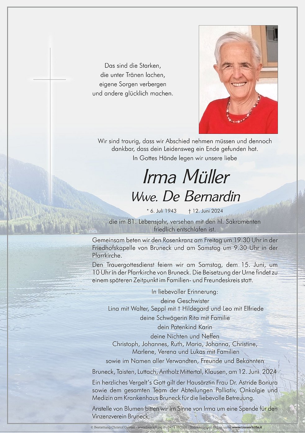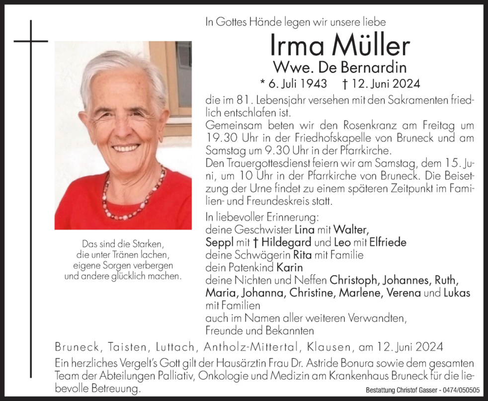 Anstelle von Blumen bitten wir im Sinne von Irma um eine Spende für den Vinzenzverein Bruneck.