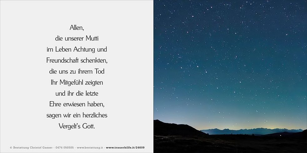 Ein besonderer Dank gilt dem Hausarzt Herrn Dr. Letterio Taormina, dem Team vom Sanitäts- und Sozialsprengel, der Belegschaft des Hauspflegedienstes, der Pflegehelferin Elena, den behandelnden Ärzten, dem Pflegepersonal der Abteilung Medizin am Krankenhaus Bruneck sowie dem Weißen Kreuz.