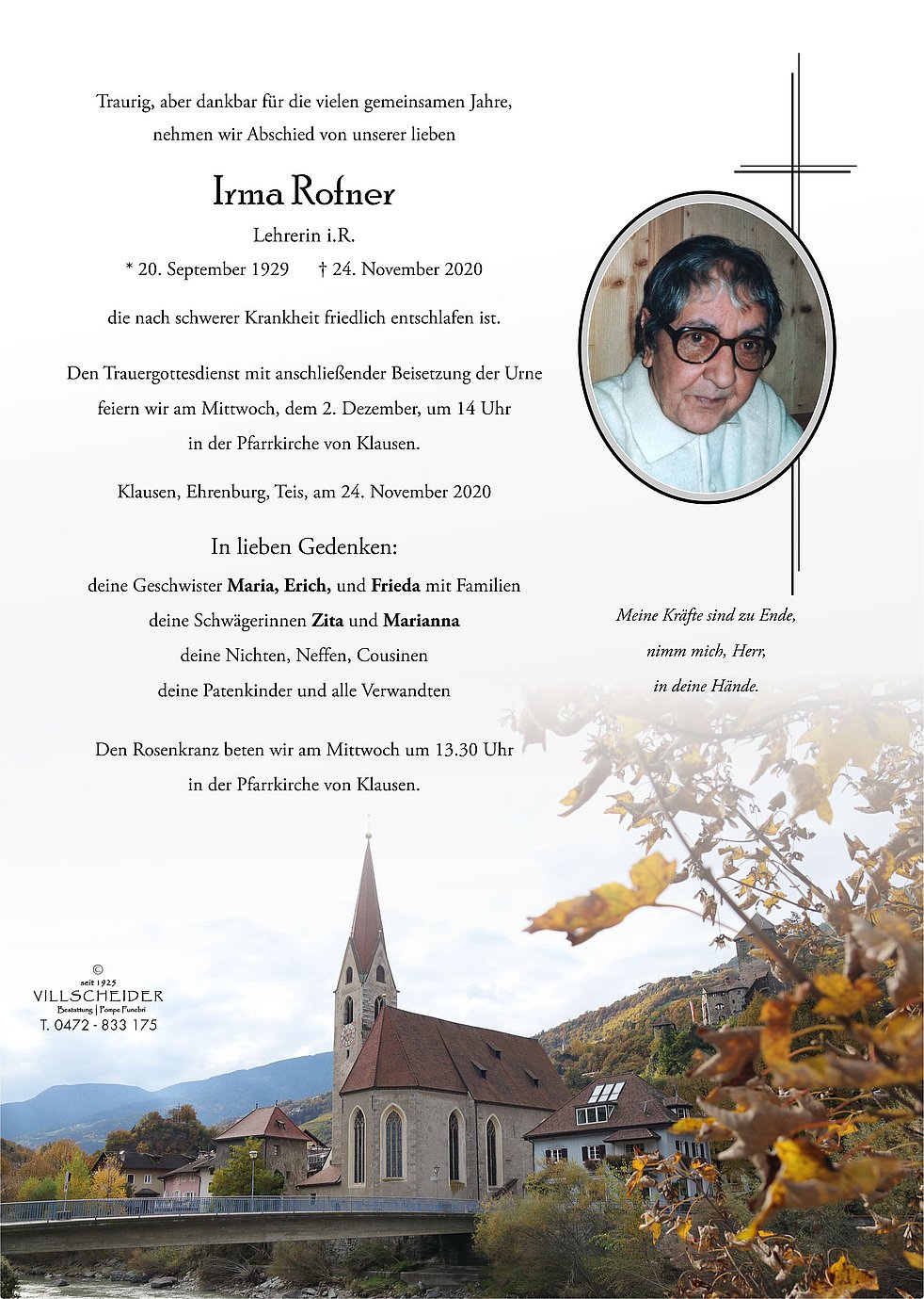 Begräbnisgottesdienst: 02.12. - 14:00 Uhr KLAUSEN