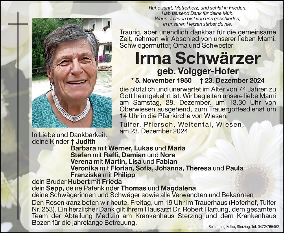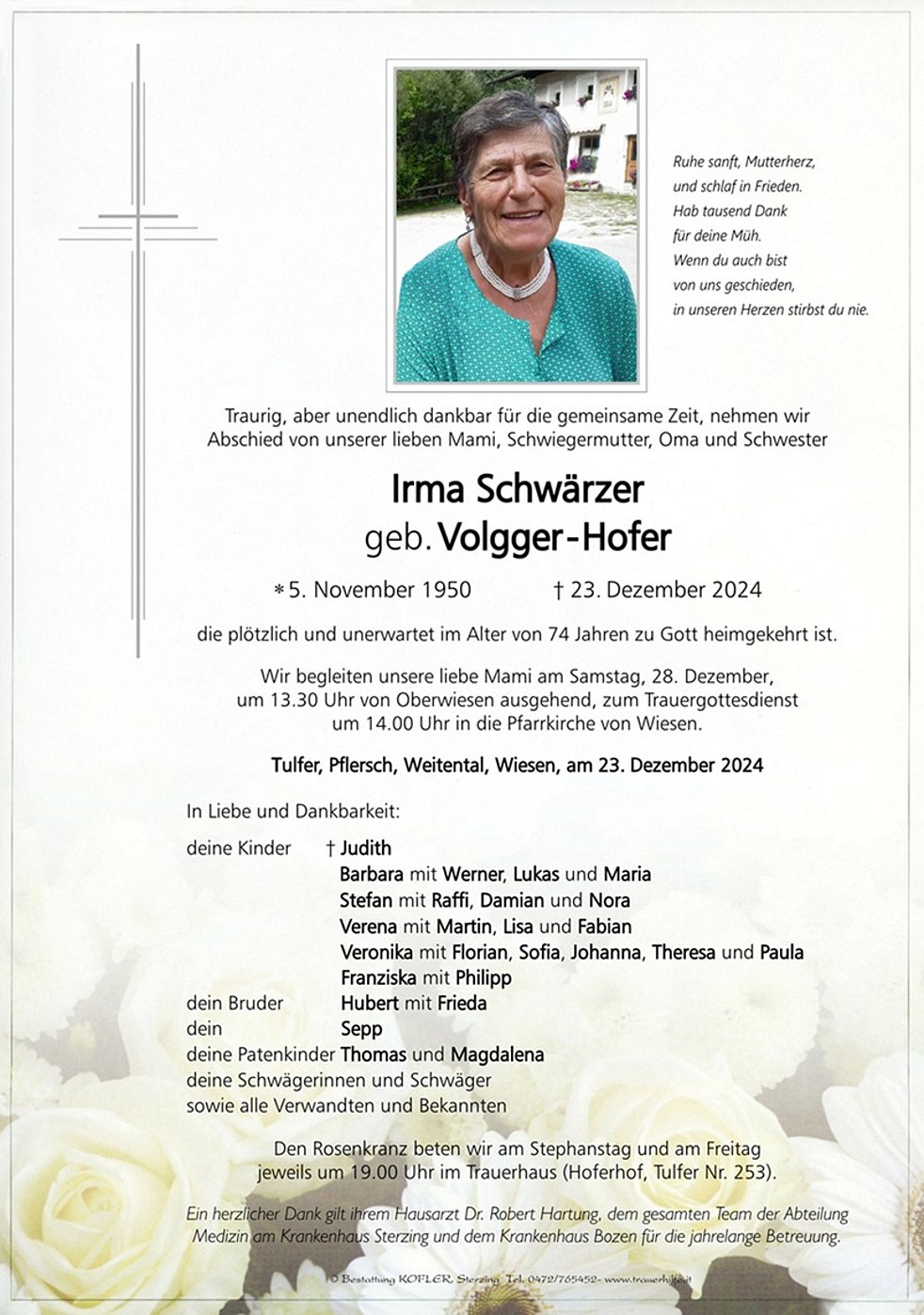 Wir begleiten unsere liebe Mami am Samstag, 28. Dezember, um 13.30 Uhr von Oberwiesen ausgehend, zum Trauergottesdienst um 14.00 Uhr in die Pfarrkirche von Wiesen.