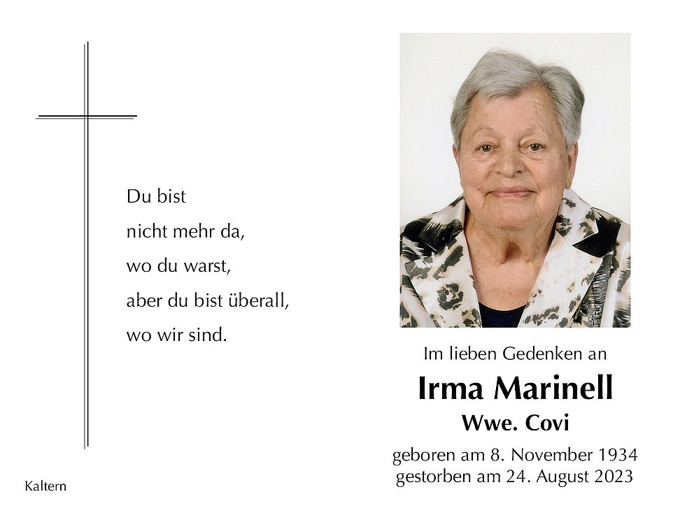 Den Trauergottesdienst feiern wir am Samstag, dem 26. August um 9 Uhr in der Pfarrkirche von Kaltern. Anschließend begleiten wir unsere liebe Verstorbene auf den Ortsfriedhof.