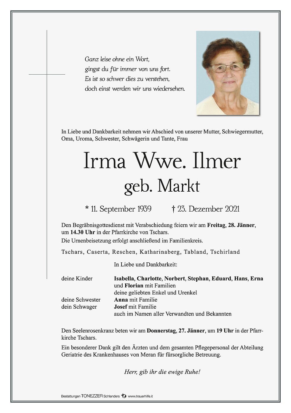 In Liebe und Dankbarkeit nehmen wir Abschied von unserer Mutter, Schwiegermutter, Oma, Uroma, Schwester, Schwägerin und Tante, Frau