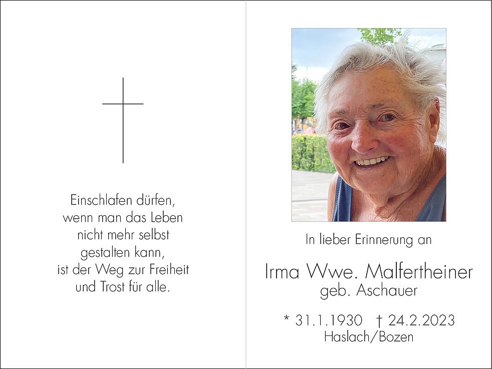 Den Trauergottesdienst mit anschließender Einsegnung feiern wir am Mittwoch, dem 1. März, um 14.30 Uhr in der St. Gertraud-Kirche in Haslach/Bozen.