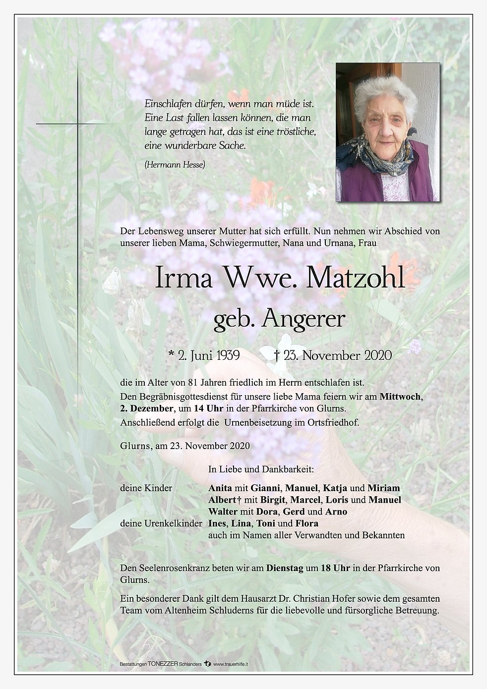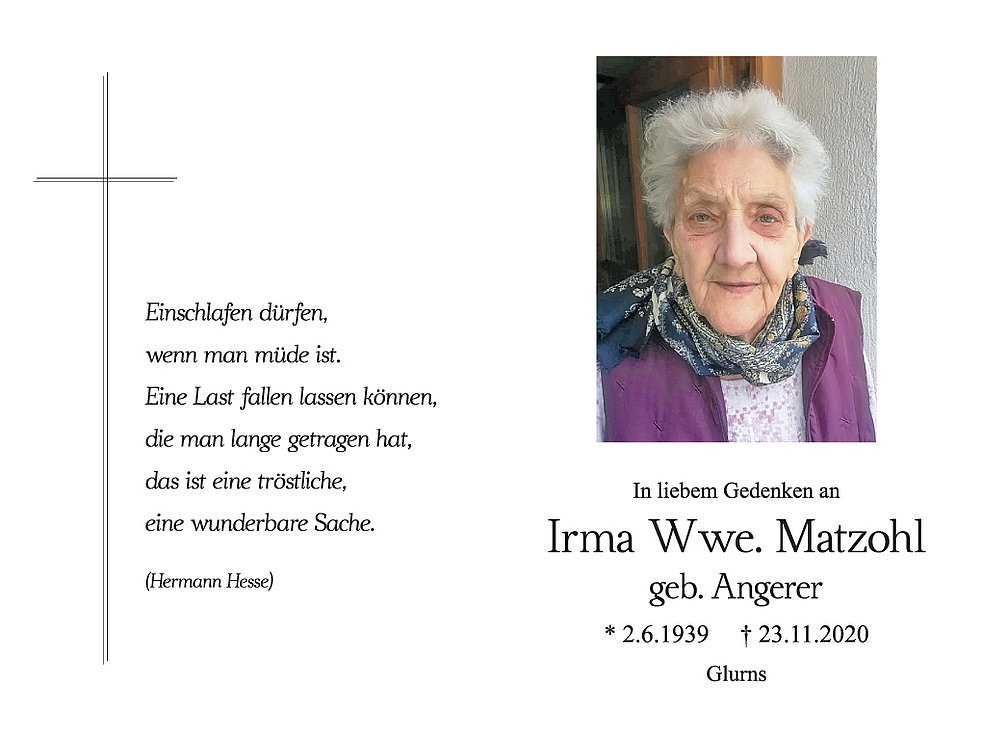 Den Begräbnisgottesdienst für unsere liebe Mama feiern wir am Mittwoch, 2. Dezember, um 14 Uhr in der Pfarrkirche von Glurns.