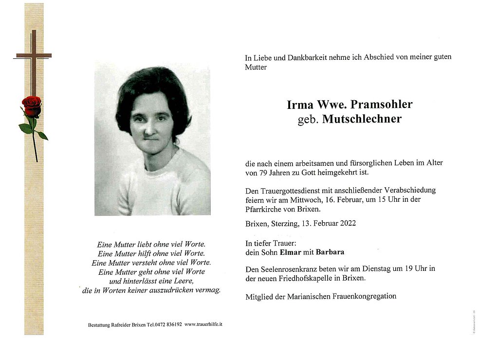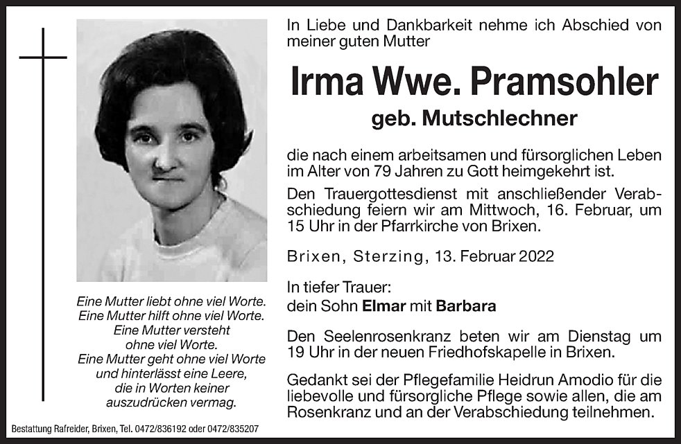 Den Trauergottesdienst mit anschließender Verabschiedung feiern wir am Mittwoch, 16. Februar, um 15 Uhr in der Pfarrkirche von Brixen.