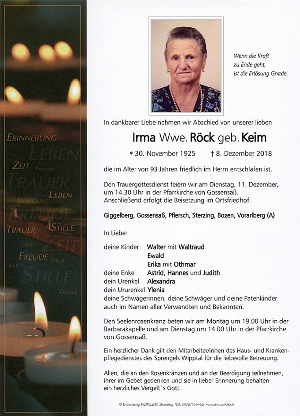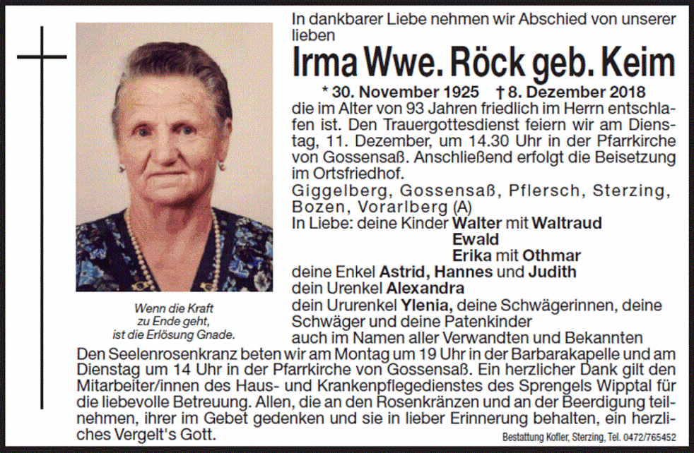 Den Trauergottesdienst feiern wir am Dienstag, 11. Dezember, um 14.30 Uhr in der Pfarrkirche von Gossensaß. Anschließend erfolgt die Beisetzung im Ortsfriedhof.