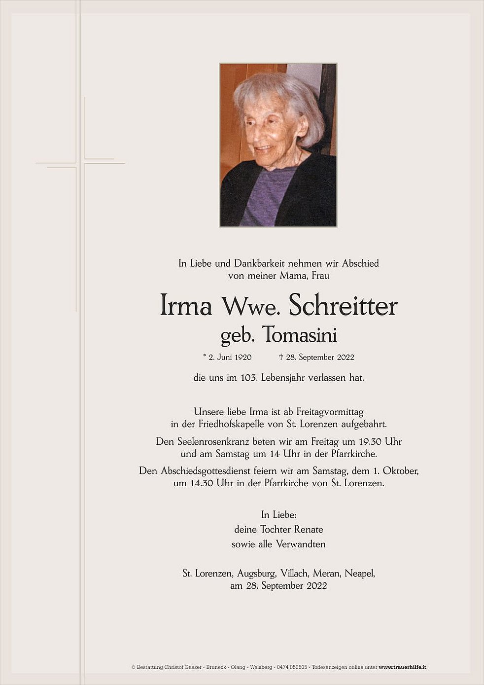Bald darauf lernte sie ihren zukünftigen Mann Josef Streiter kennen und lieben. Irma arbeitete bis zu ihrer Pensionierung am Gericht in Bruneck.