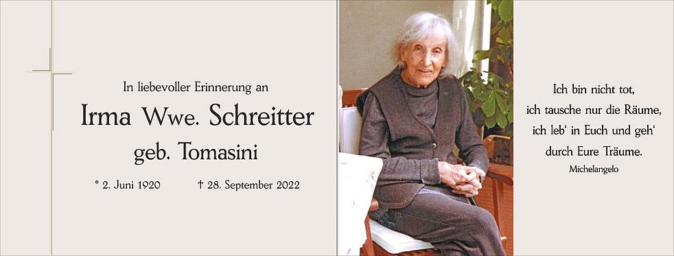 Im Alter von 102 Jahren hat Irma ihr Leben in die Hände Gottes zurückgelegt.