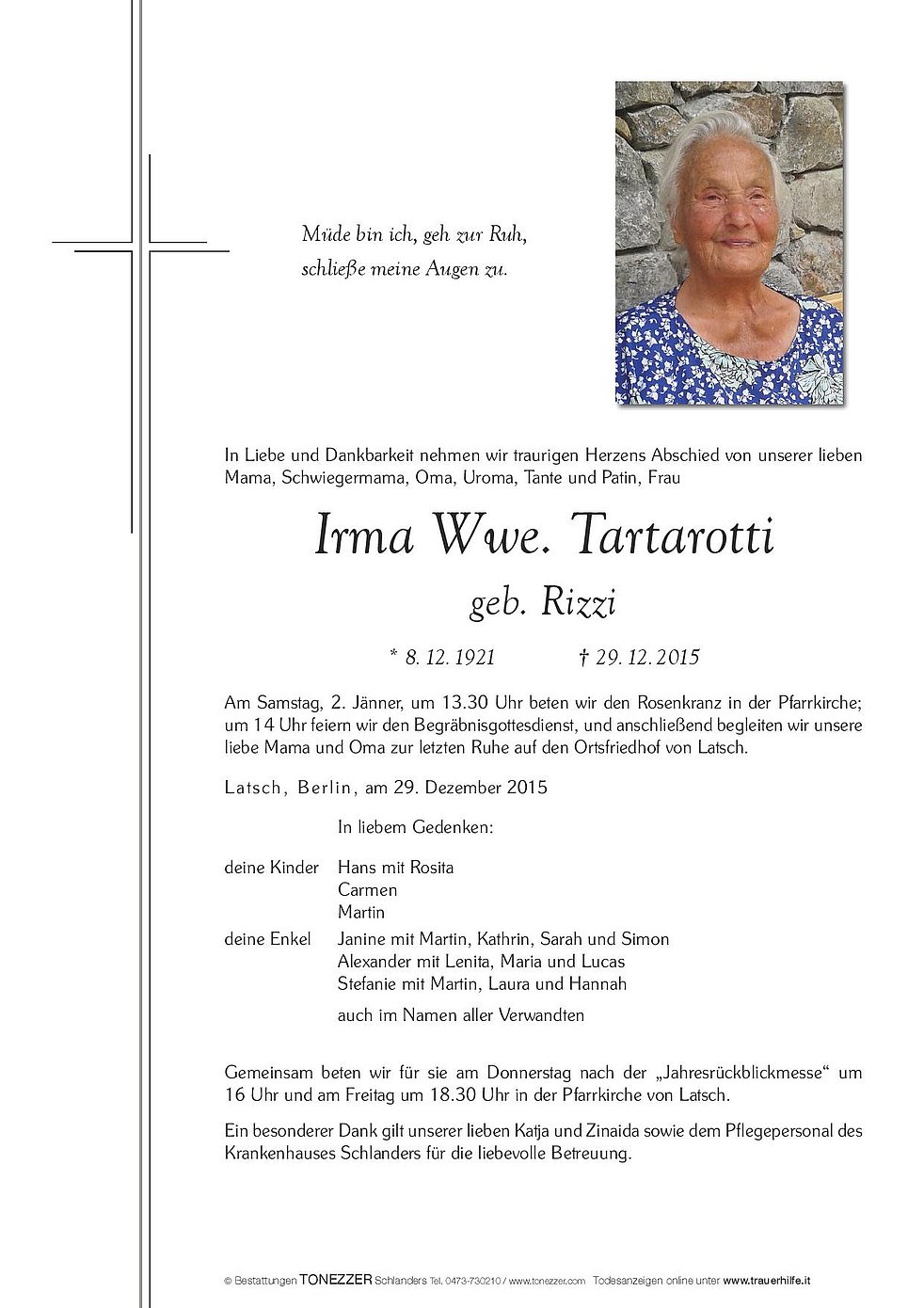 Am Samstag, 2. Jänner, um 13.30 Uhr beten wir den Rosenkranz in der Pfarrkirche; um 14 Uhr feiern wir den Begräbnisgottesdienst, und anschließend begleiten wir unsere liebe Mama und Oma zur letzten Ruhe auf den Ortsfriedhof von Latsch.