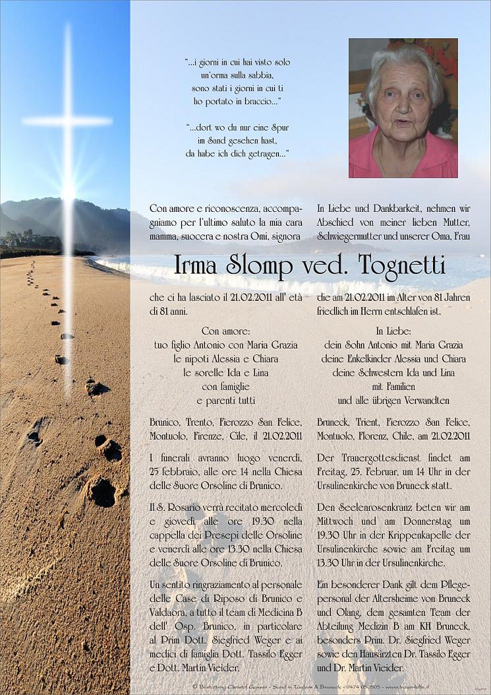 Der Trauergottesdienst findet am Freitag, 25. Februar, um 14 Uhr in der Ursulinenkirche von Bruneck statt.