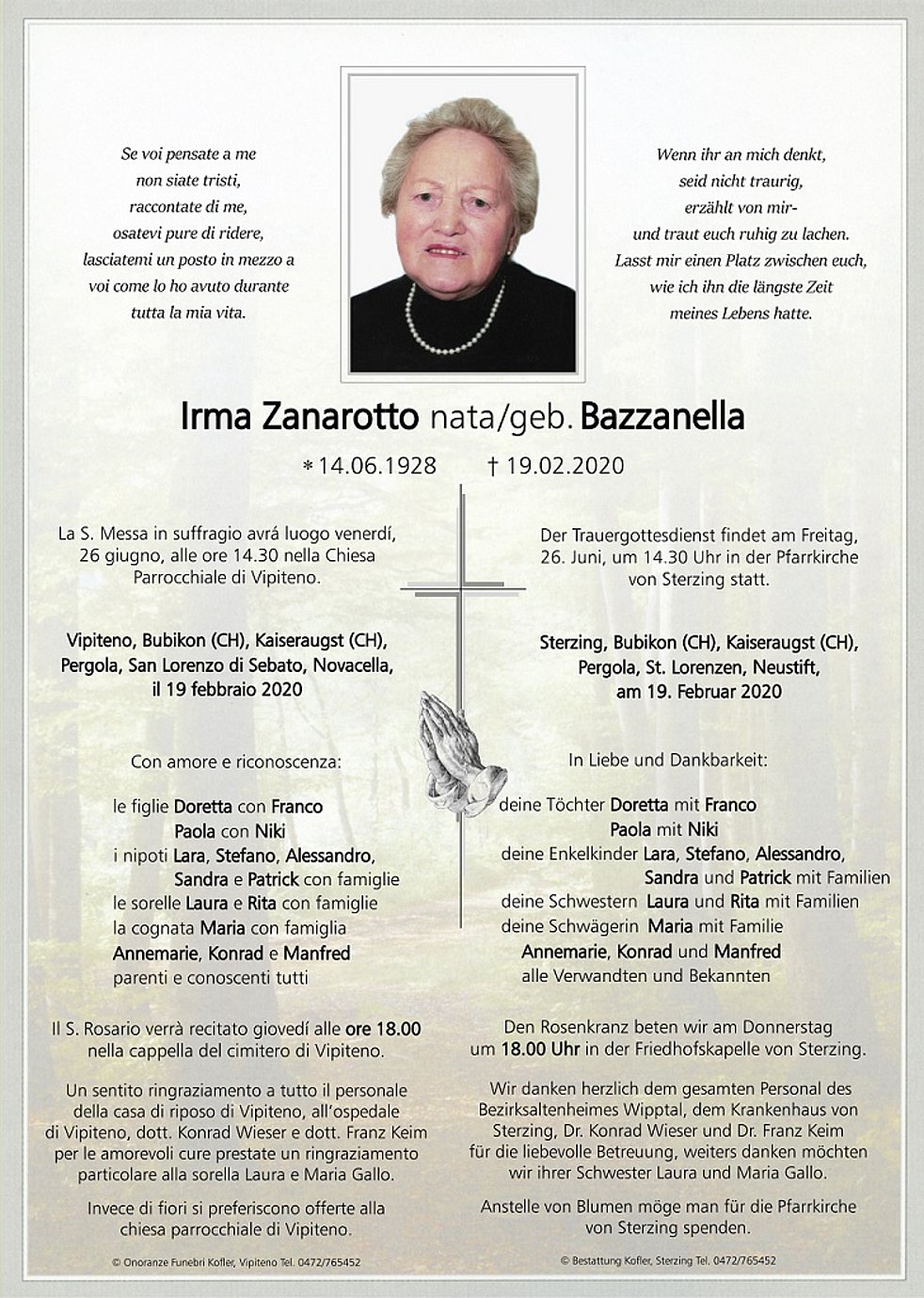 Wir danken herzlich dem gesamten Personal des Bezirksaltenheimes Wipptal, dem Krankenhaus von Sterzing, Dr. Konrad Wieser und Dr. Franz Keim für die liebevolle Betreuung, weiters danken möchten wir ihrer Schwester Laura und Maria Gallo.