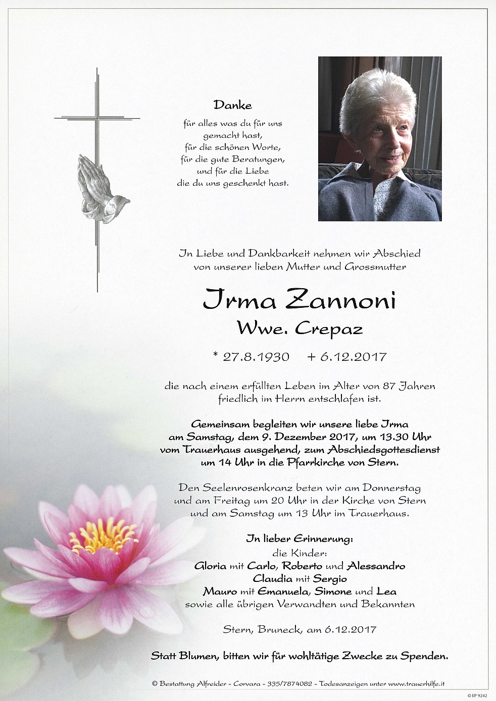 Gemeinsam begleiten wir unsere liebe Irma am Samstag, dem 9. Dezember 2017, um 13.30 Uhr vom Trauerhaus ausgehend, zum Abschiedsgottesdienst um 14 Uhr in die Pfarrkirche von Stern.