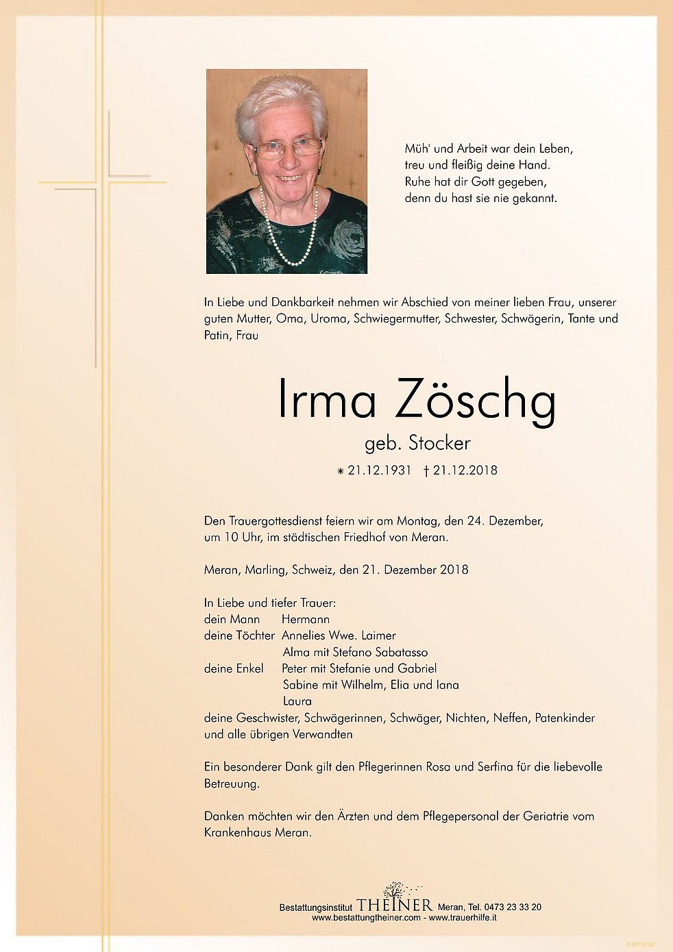 Den Trauergottesdienst feiern wir am Montag, den 24. Dezember, um 10 Uhr, im städtischen Friedhof von Meran.
