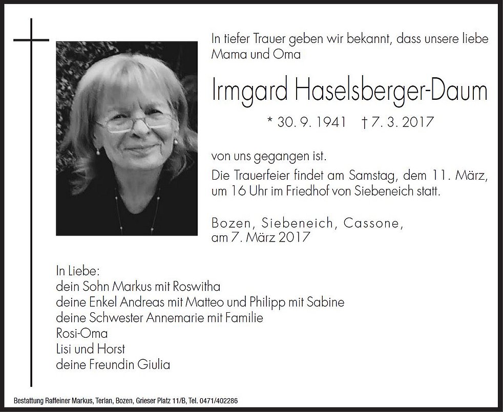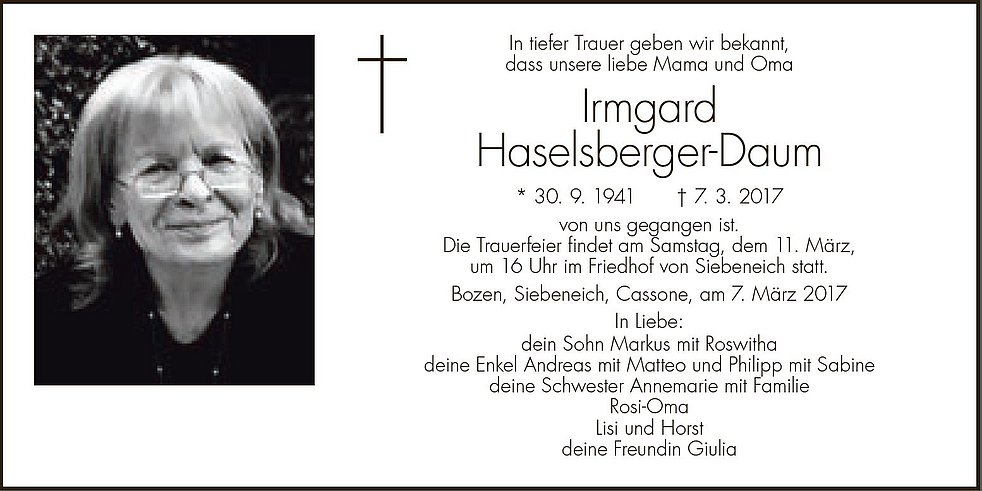 Die Trauerfeier findet am Samstag, dem 11. März, um 16 Uhr im Friedhof von Siebeneich statt.