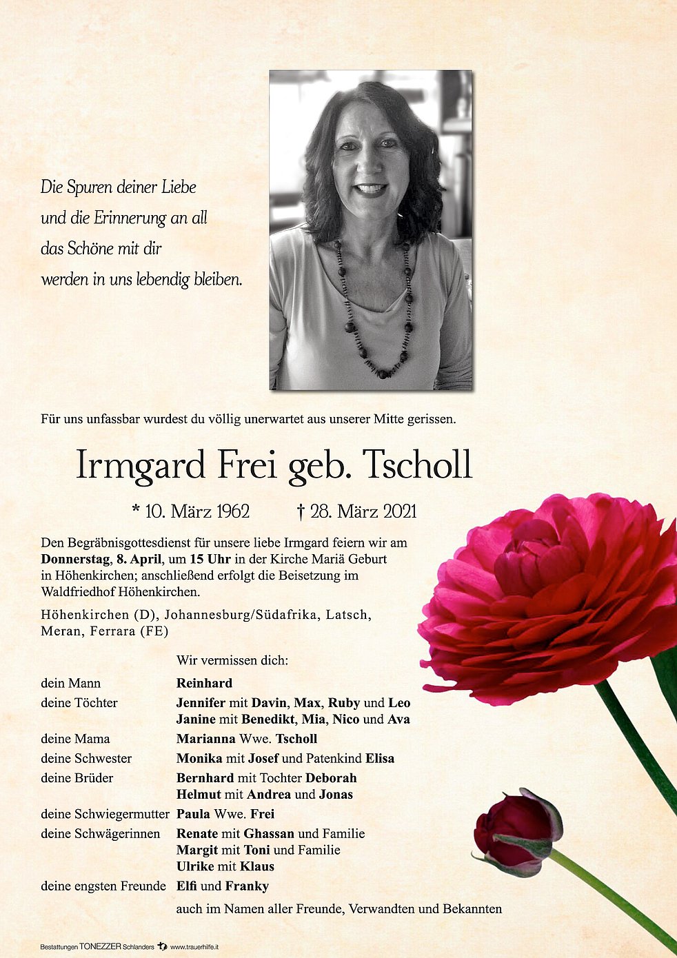 Den Begräbnisgottesdienst für unsere liebe Irmgard feiern wir am Donnerstag, 8. April, um 15 Uhr in der Kirche Mariä Geburt in Höhenkirchen; anschließend erfolgt die Beisetzung im Waldfriedhof Höhenkirchen.