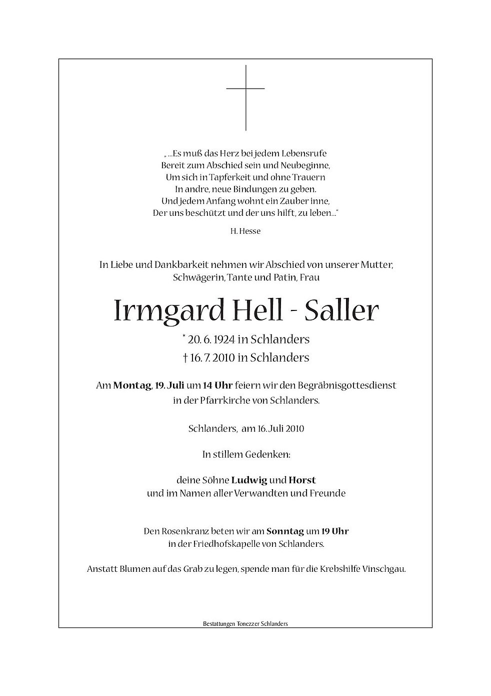 Anstatt Blumen auf das Grab zu legen, spende man für die Krebshilfe Vinschgau.