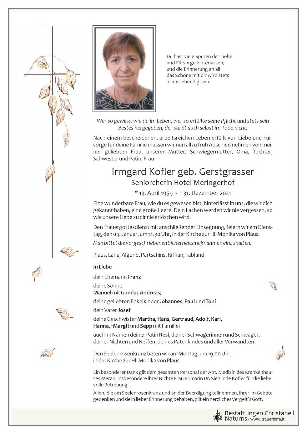 Den Trauergottesdienst mit anschließender Einsegnung, feiern wir am Dienstag, den 04. Januar, um 14.30 Uhr, in der Kirche zur Hl. Monika von Plaus.
