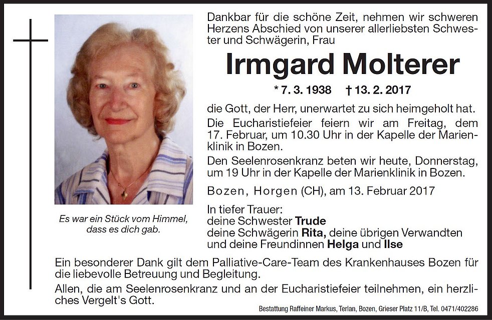 Ein besonderer Dank gilt dem Palliativ-Care-Team des Krankenhauses von Bozen für die liebevolle Betreuung und Begleitung.