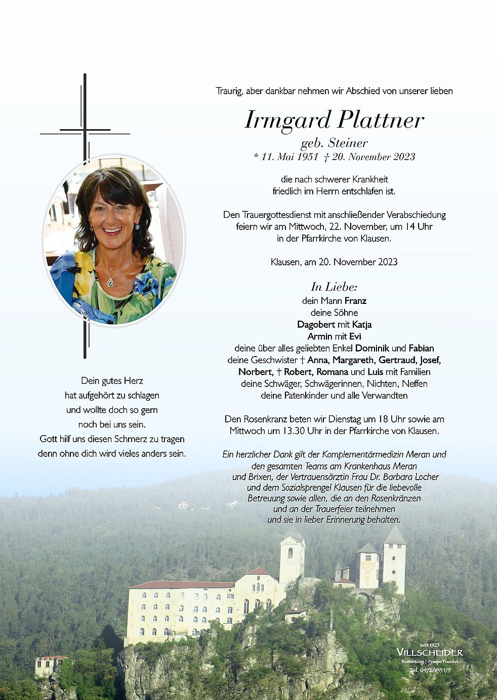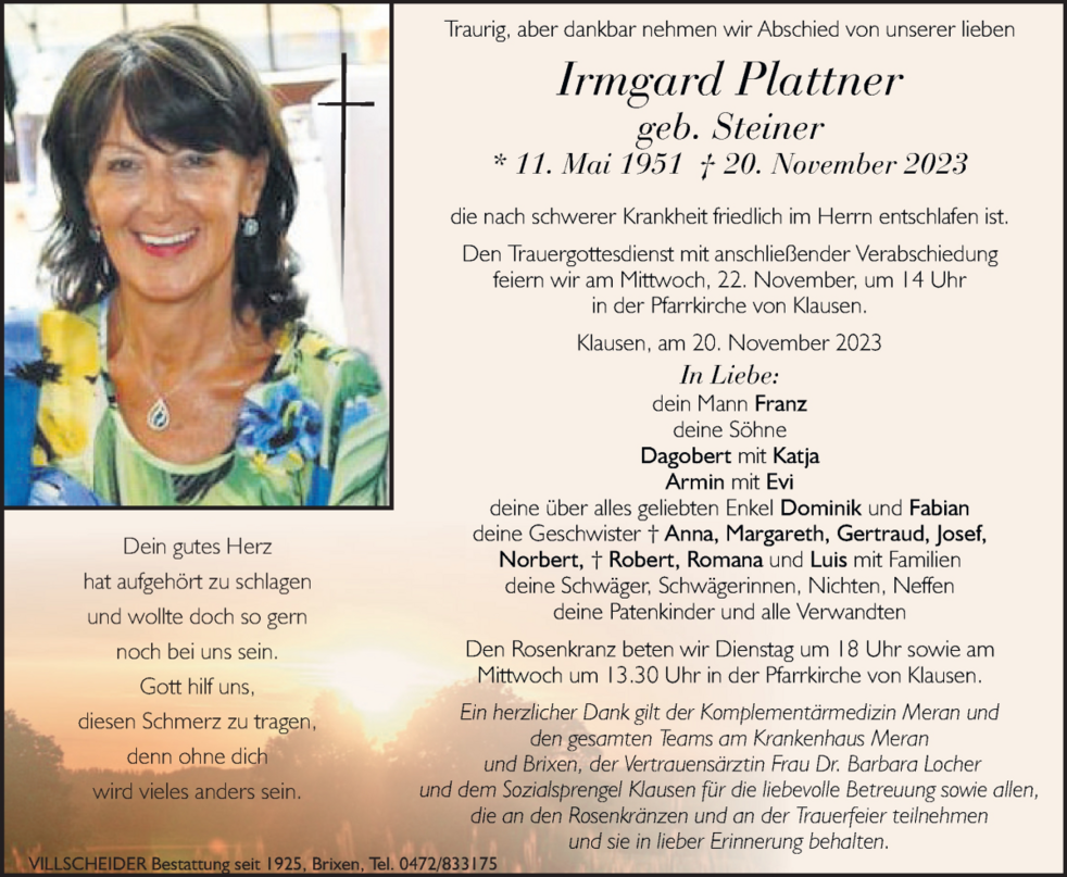 Liebe Irma, du bisch die beschte Patin wos man sich wünschn hot gekennt...mir hobns gschofft, über die Johre olm in Kontakt zu bleibn. Danke für die vieln nettn Ratscher, i werr di nia vergessn, du worsch so a herzlicher Sonnenschein. Ruhe in Frieden und lieber Franz, Dagobert und Armin, i trauer fescht mit enk...