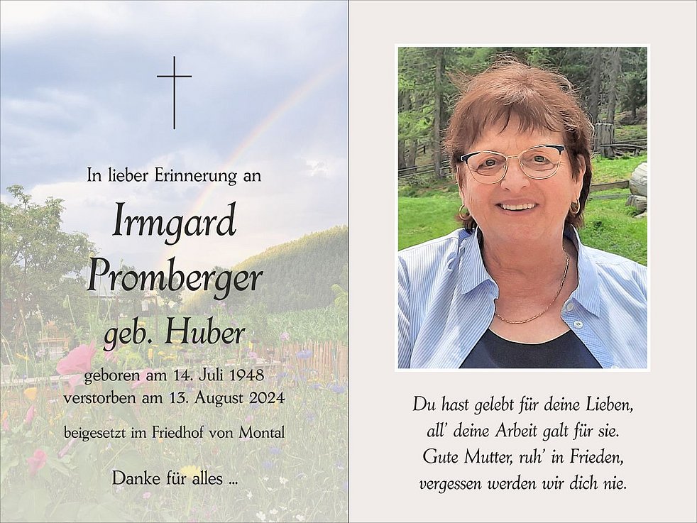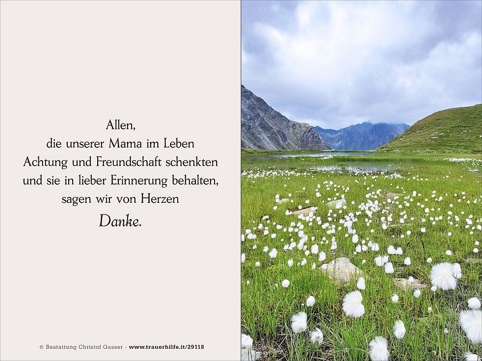 Unser aufrichtiger Dank gilt dem Hausarzt Herrn Dr. Martin Kofler sowie den behandelnden Ärzten und dem Pflegepersonal am Krankenhaus Bruneck, besonders Frau Dr. Monika Hilber mit ihrem Team der Abteilung Palliativ für die liebevolle Betreuung.