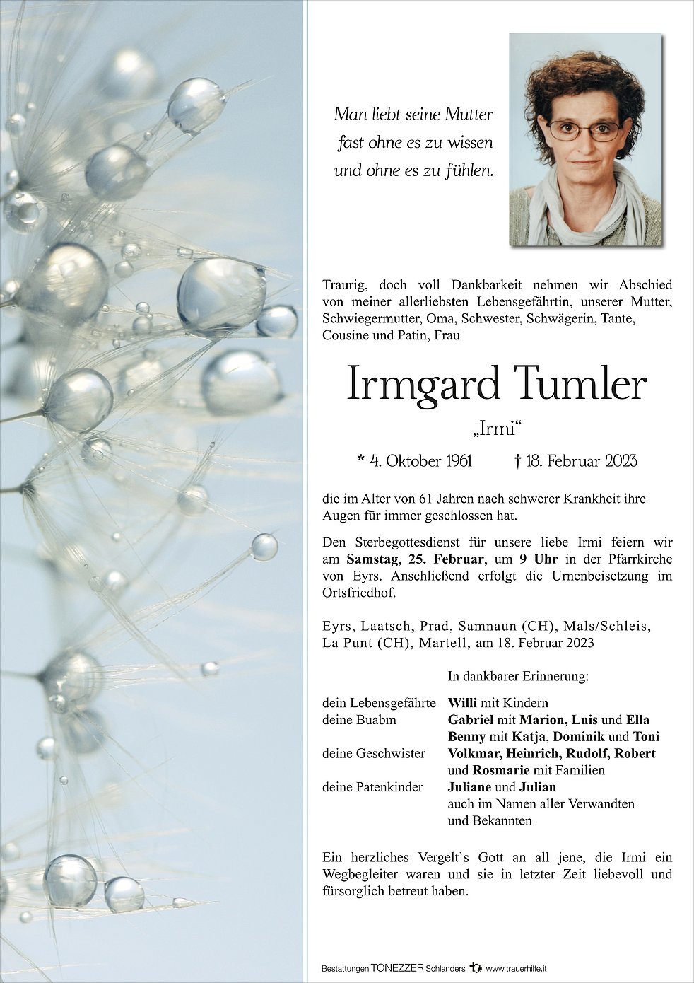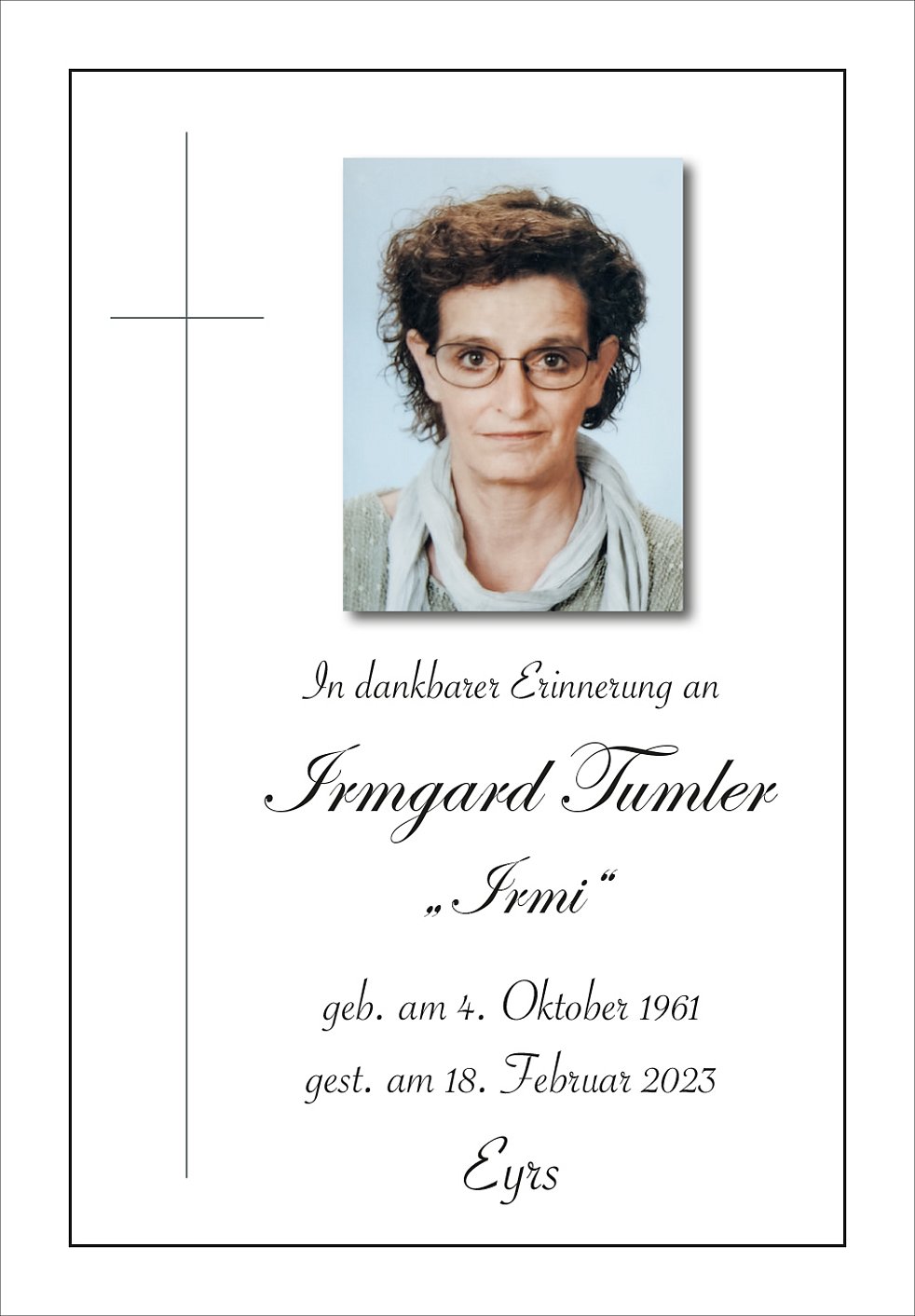 Den Sterbegottesdienst für unsere liebe Irmi feiern wir am Samstag, 25. Februar, um 9 Uhr in der Pfarrkirche von Eyrs.