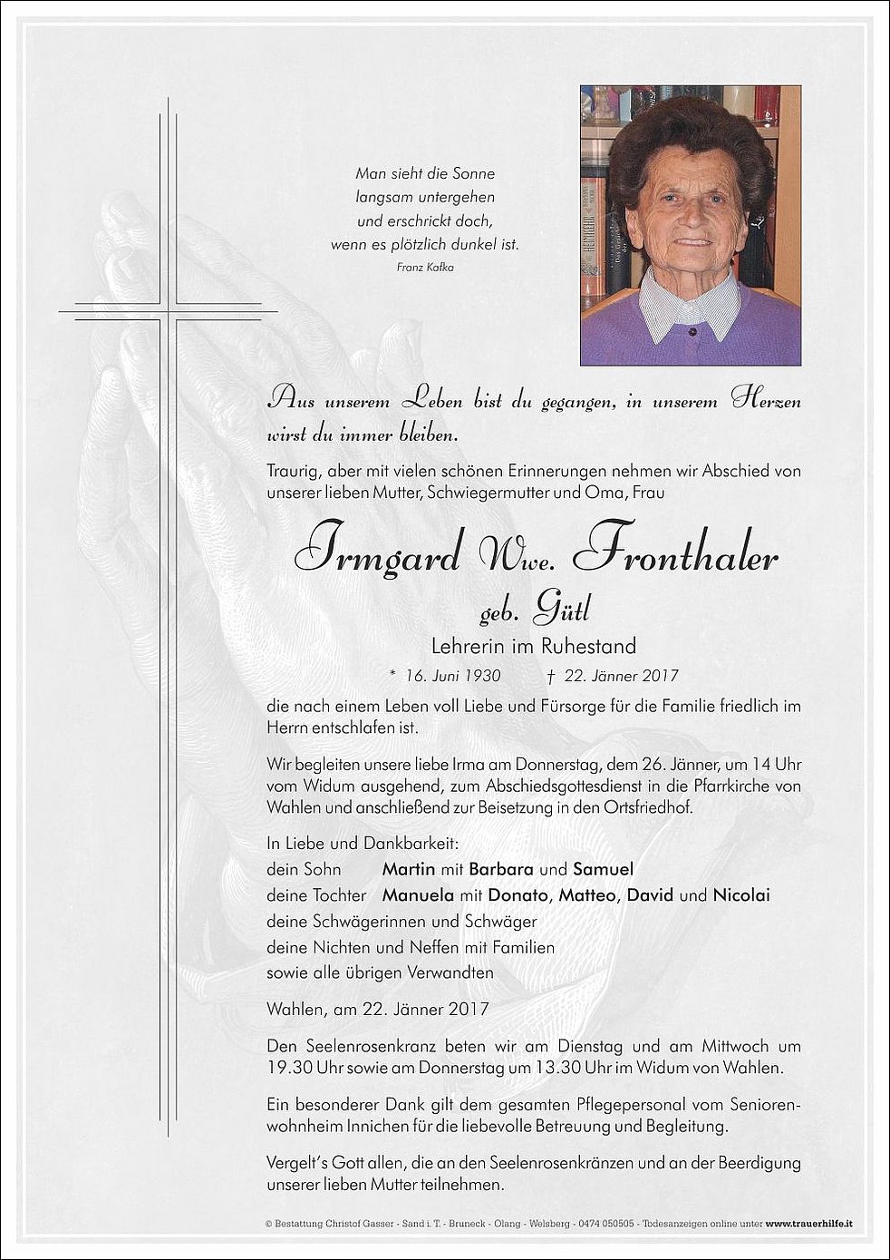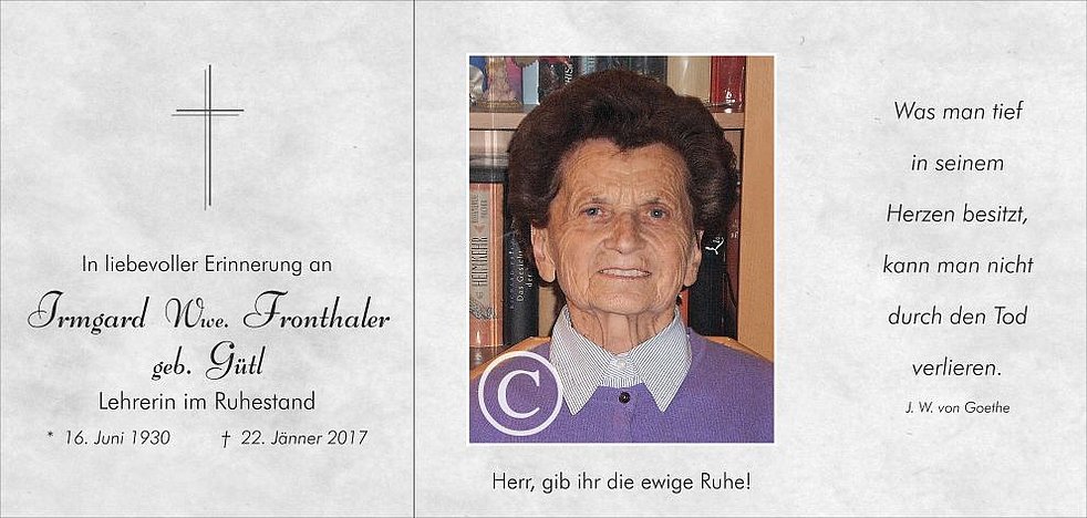 Wir begleiten unsere liebe Irma am Donnerstag, dem 26. Jänner, um 14 Uhr vom Widum ausgehend, zum Abschiedsgottesdienst in die Pfarrkirche von Wahlen und anschließend zur Beisetzung in den Ortsfriedhof.