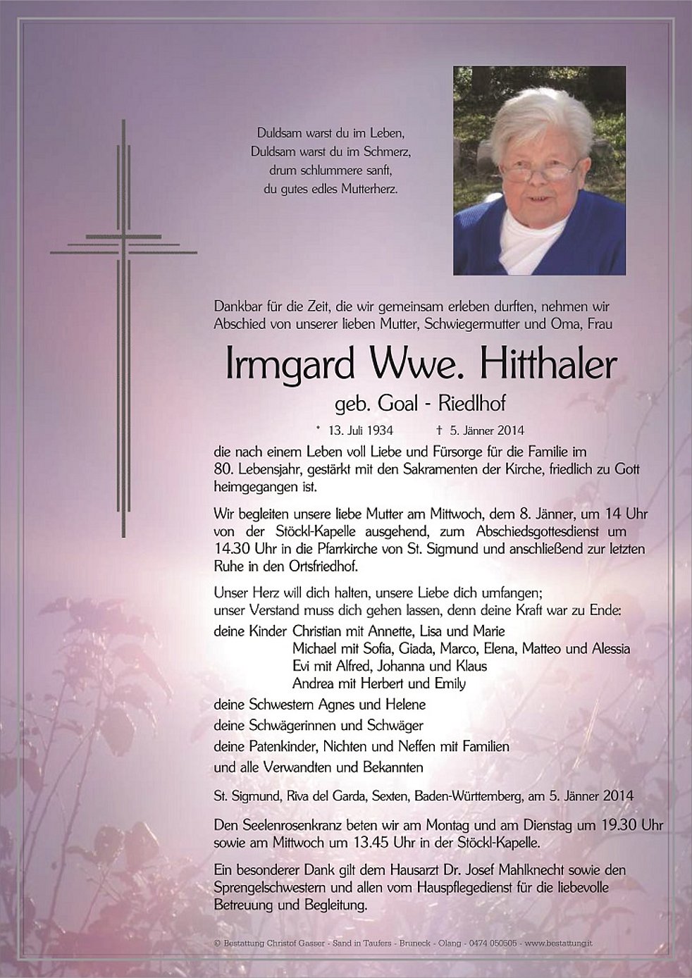 Wir wollen Euch auf diesem Wege unsere Anteilnahme und Trauer über den Verlust Euren Mutter übermitteln. Gerne denken wir an die die schöne Zeiten in Südtirol mit Tante Irmgard, Onkel Sepp und Eurer Familie zurück.