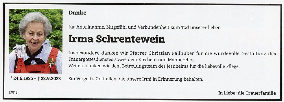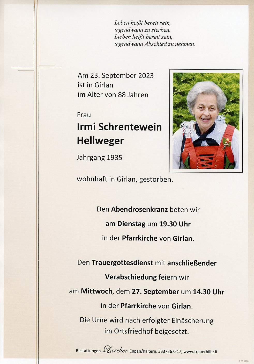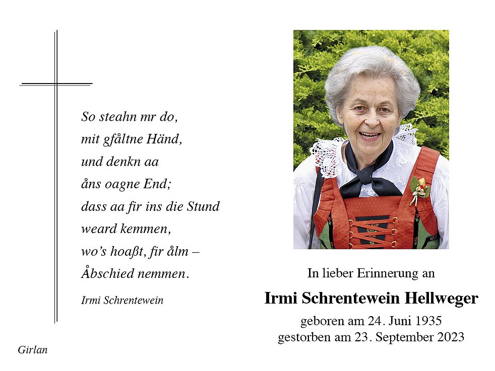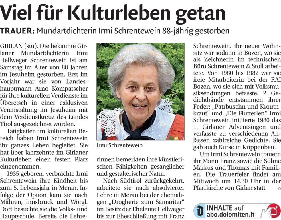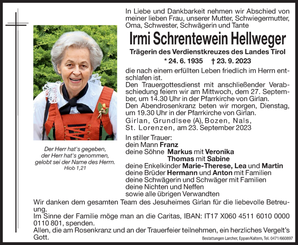 Den Trauergottesdienst mit anschließender Verabschiedung feiern wir am Mittwoch, dem 27. September um 14.30 Uhr in der Pfarrkirche von Girlan.