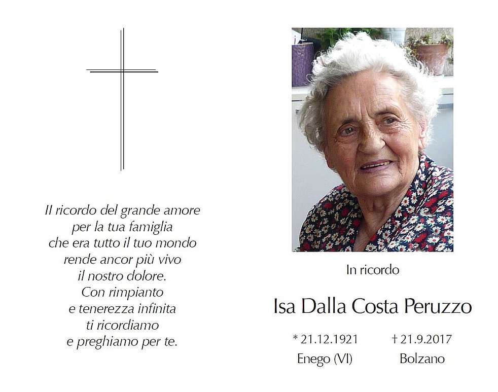 Ne danno il triste annuncio i figli Walter con Silvana, Anita con Romeo, Gianna con Remo, Franco con Herta, nipoti, pronipoti e parenti tutti.