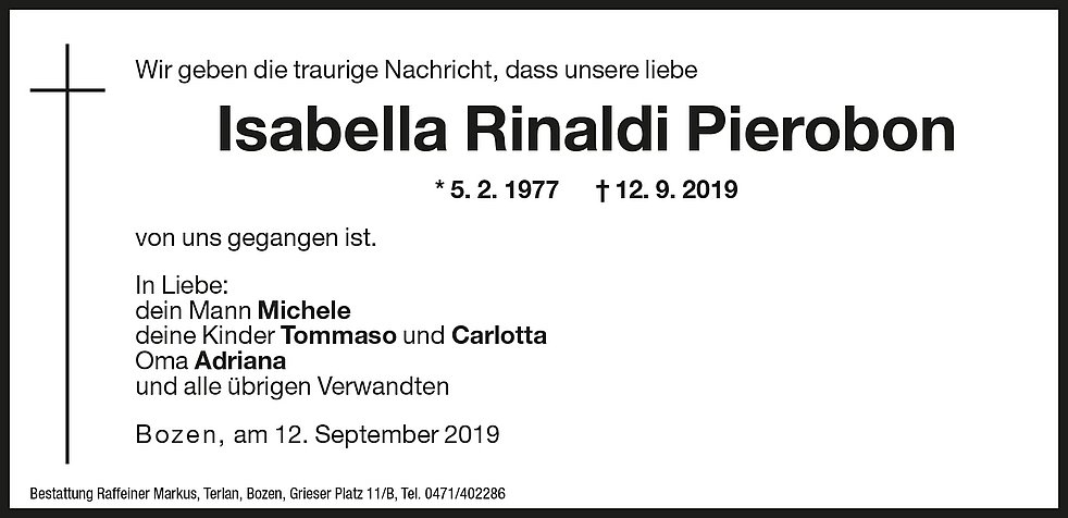 Ne danno il triste annuncio con immenso dolore il marito Michele, i figli Tommaso e Carlotta, nonna Adriana e parenti tutti.