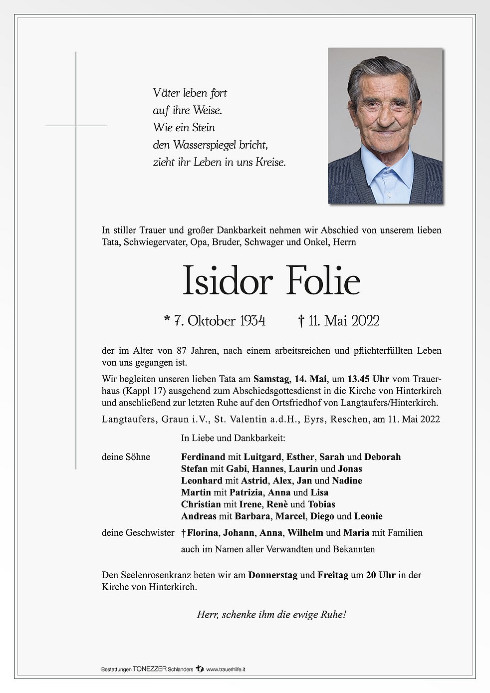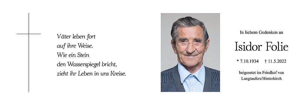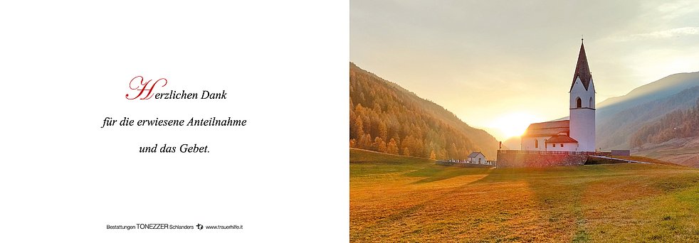 Wir begleiten unseren lieben Tata am Samstag, 14. Mai, um 13.45 Uhr vom Trauerhaus (Kappl 17) ausgehend zum Abschiedsgottesdienst in die Kirche von Hinterkirch und anschließend zur letzten Ruhe auf den Ortsfriedhof von Langtaufers/Hinterkirch.