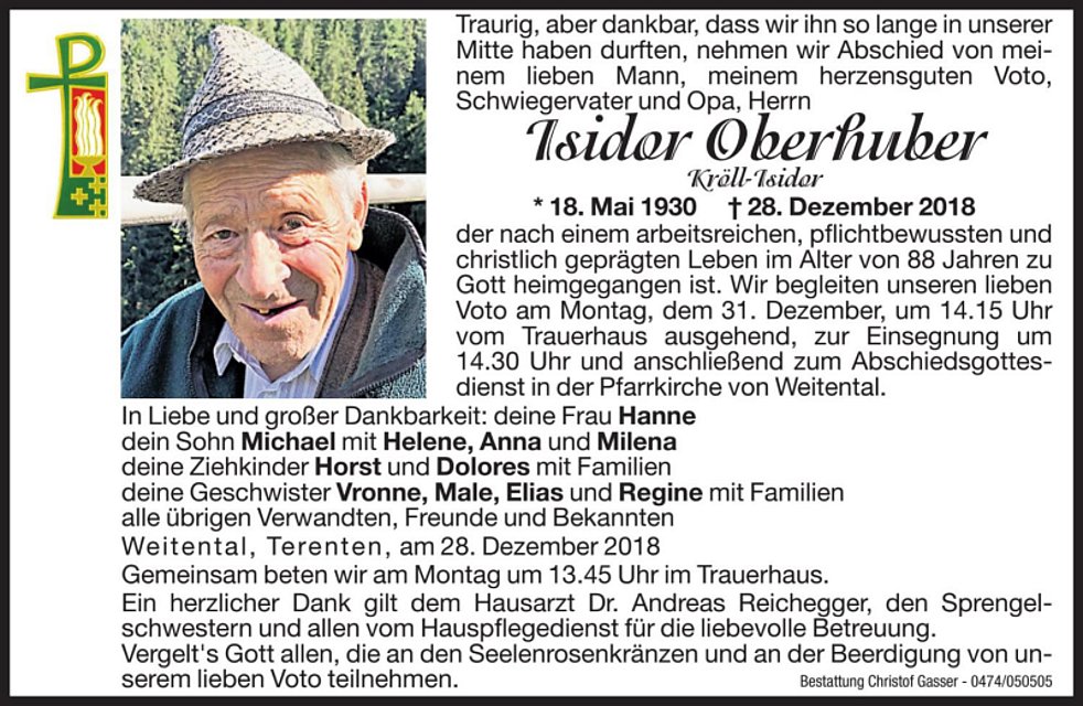 Wir begleiten unseren lieben Voto am Montag, dem 31. Dezember, um 14.15 Uhr vom Trauerhaus ausgehend, zur Einsegnung um 14.30 Uhr und anschließend zum Abschiedsgottesdienst in der Pfarrkirche von Weitental.