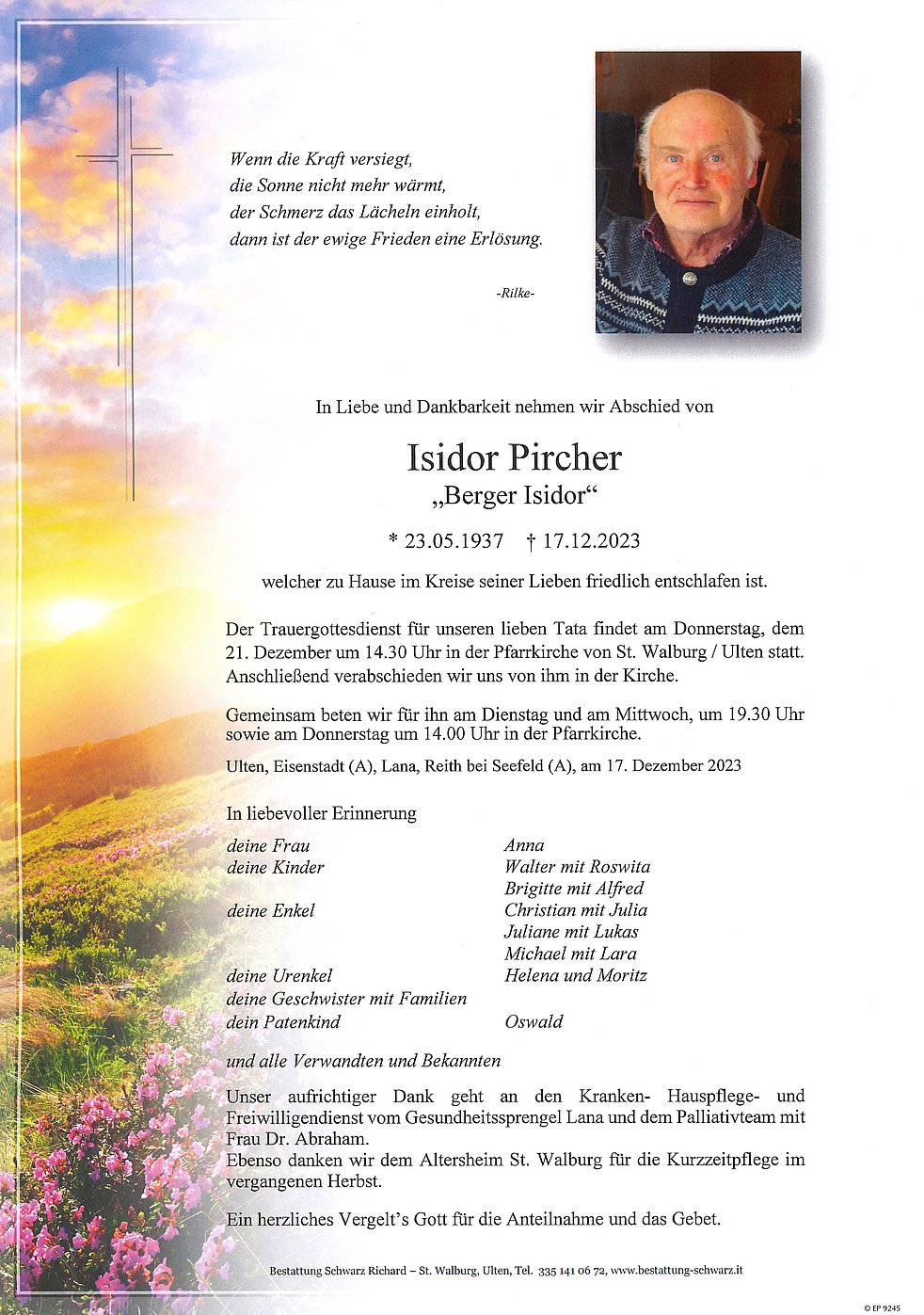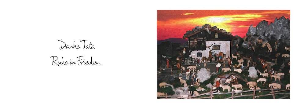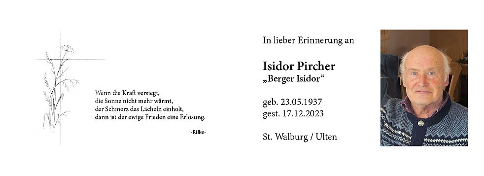 Der Trauergottesdienst für unseren lieben Tata findet am Donnerstag, dem 21. Dezember um 14.30 Uhr in der Pfarrkirche von St. Walburg / Ulten statt.