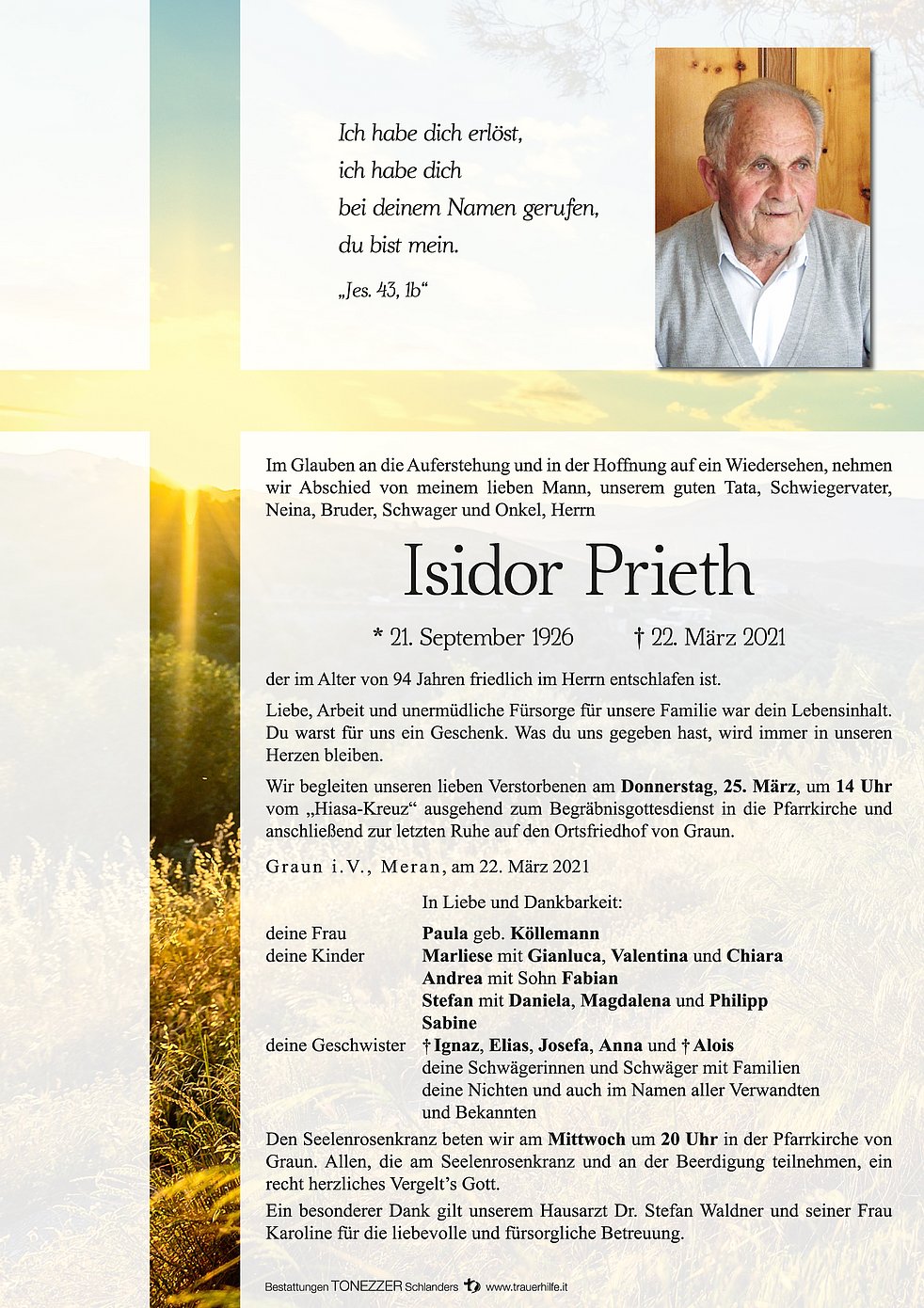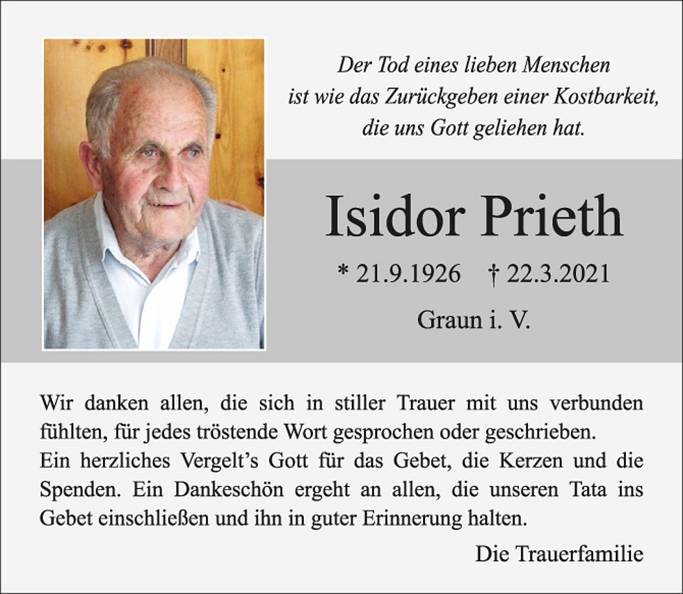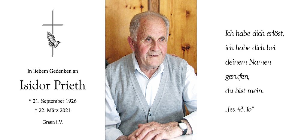 Wir begleiten unseren lieben Verstorbenen am Donnerstag, 25. März, um 14 Uhr vom „Hiasa-Kreuz“ ausgehend zum Begräbnisgottesdienst in die Pfarrkirche und anschließend zur letzten Ruhe auf den Ortsfriedhof von Graun.