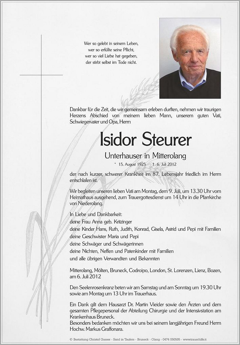 Wir begleiten unseren lieben Vati am Montag, dem 9. Juli, um 13.30 Uhr vom Heimathaus ausgehend, zum Trauergottesdienst um 14 Uhr in die Pfarrkirche von Niederolang.