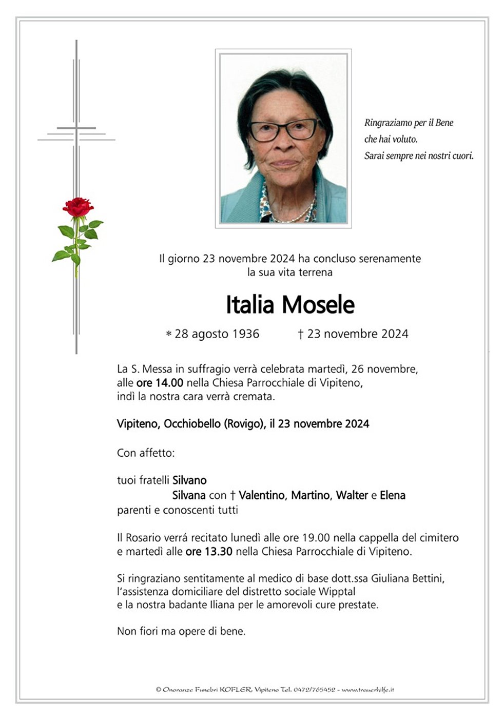Si ringraziano sentitamente al medico di base dott.ssa Giuliana Bettini, l‘assistenza domiciliare del distretto sociale Wipptal e la nostra badante Iliana per le amorevoli cure prestate.